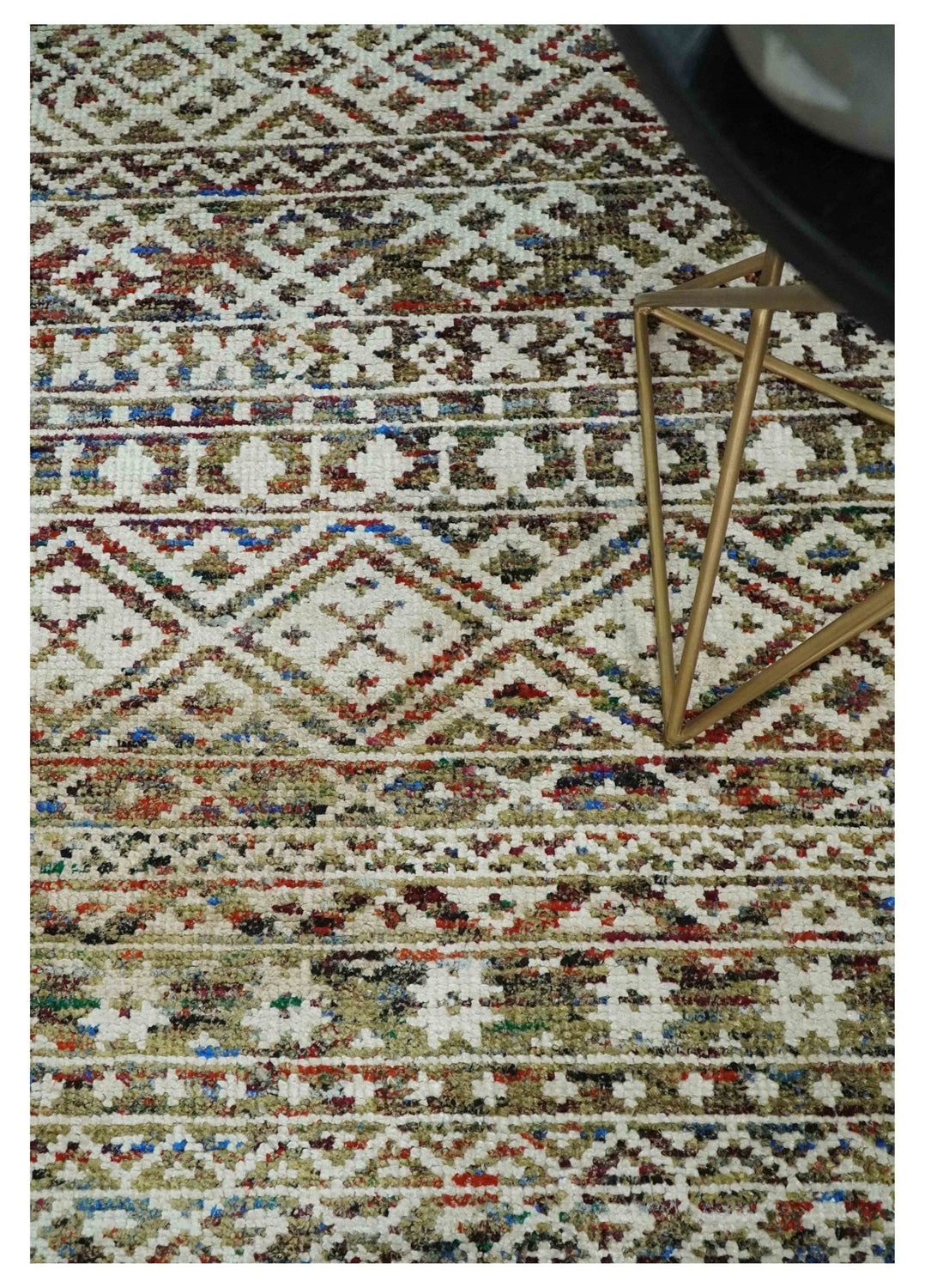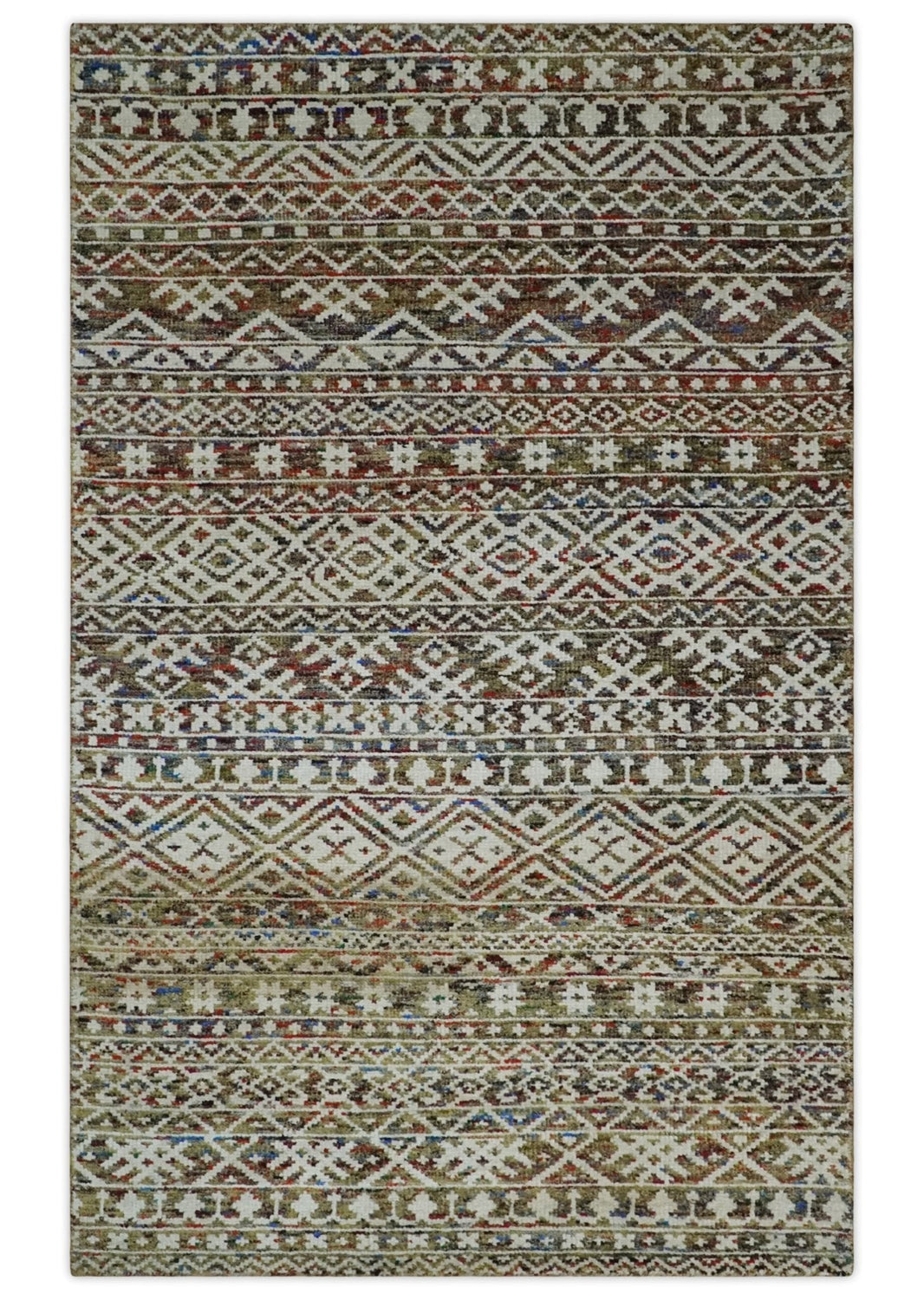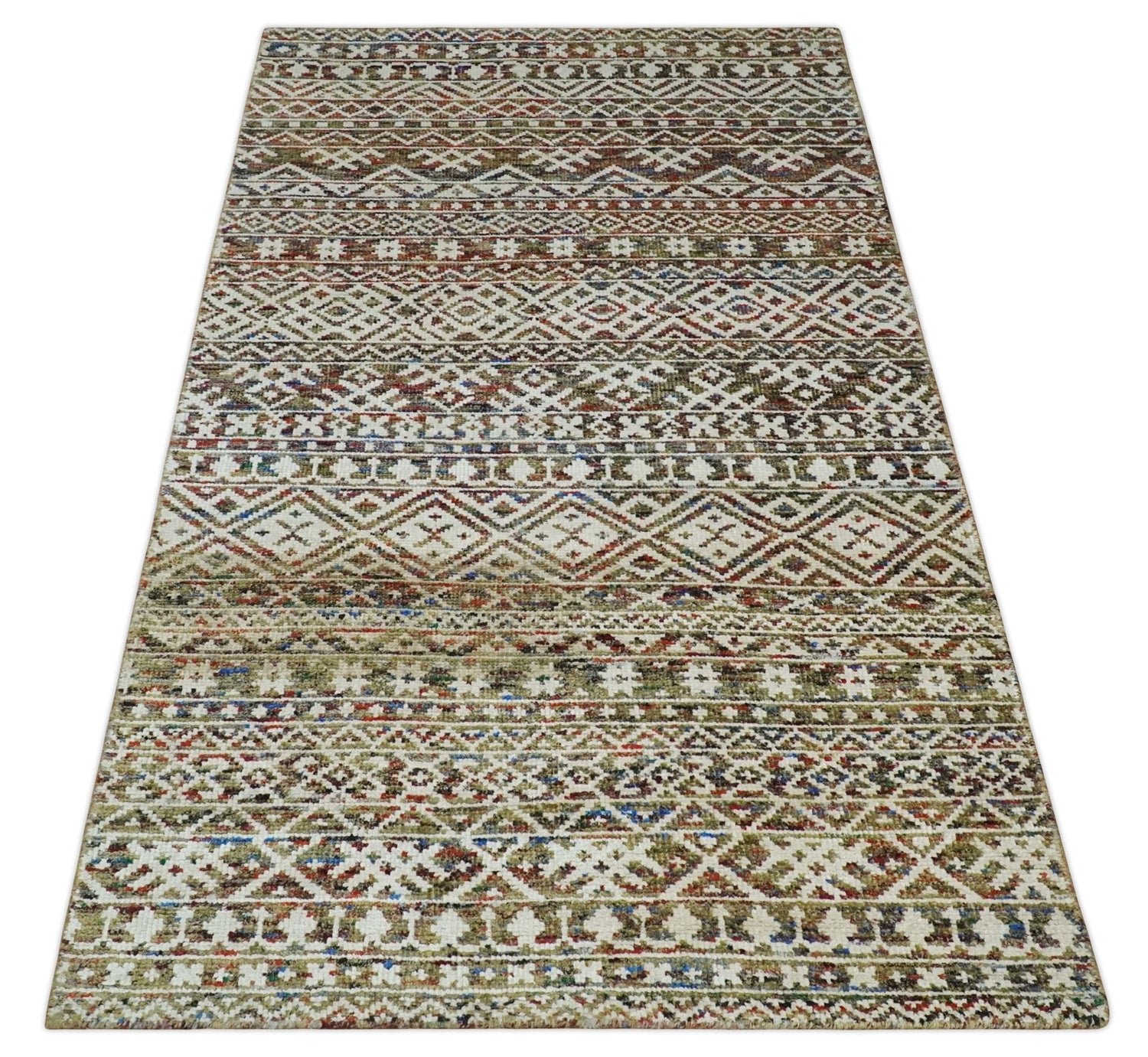 5x8 Hand Knotted Ivory, Olive and Rust Modern Contemporary Southwestern Tribal Trellis Recycled Silk Area Rug | OP121