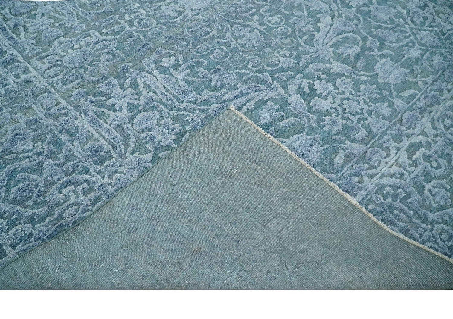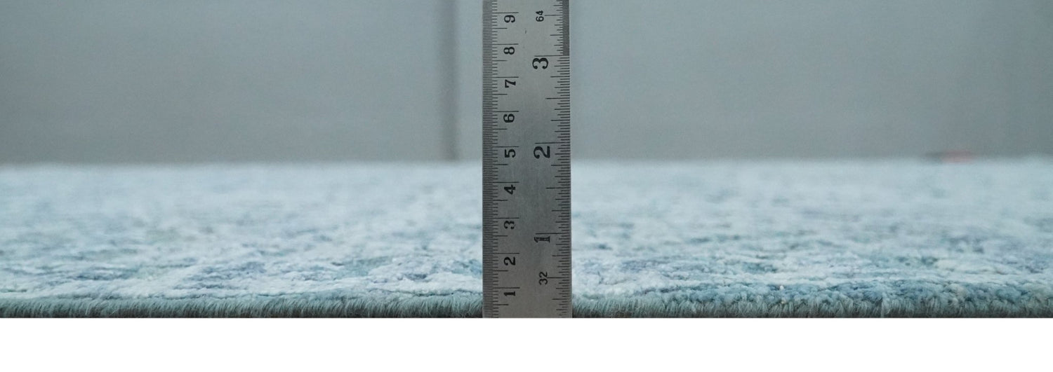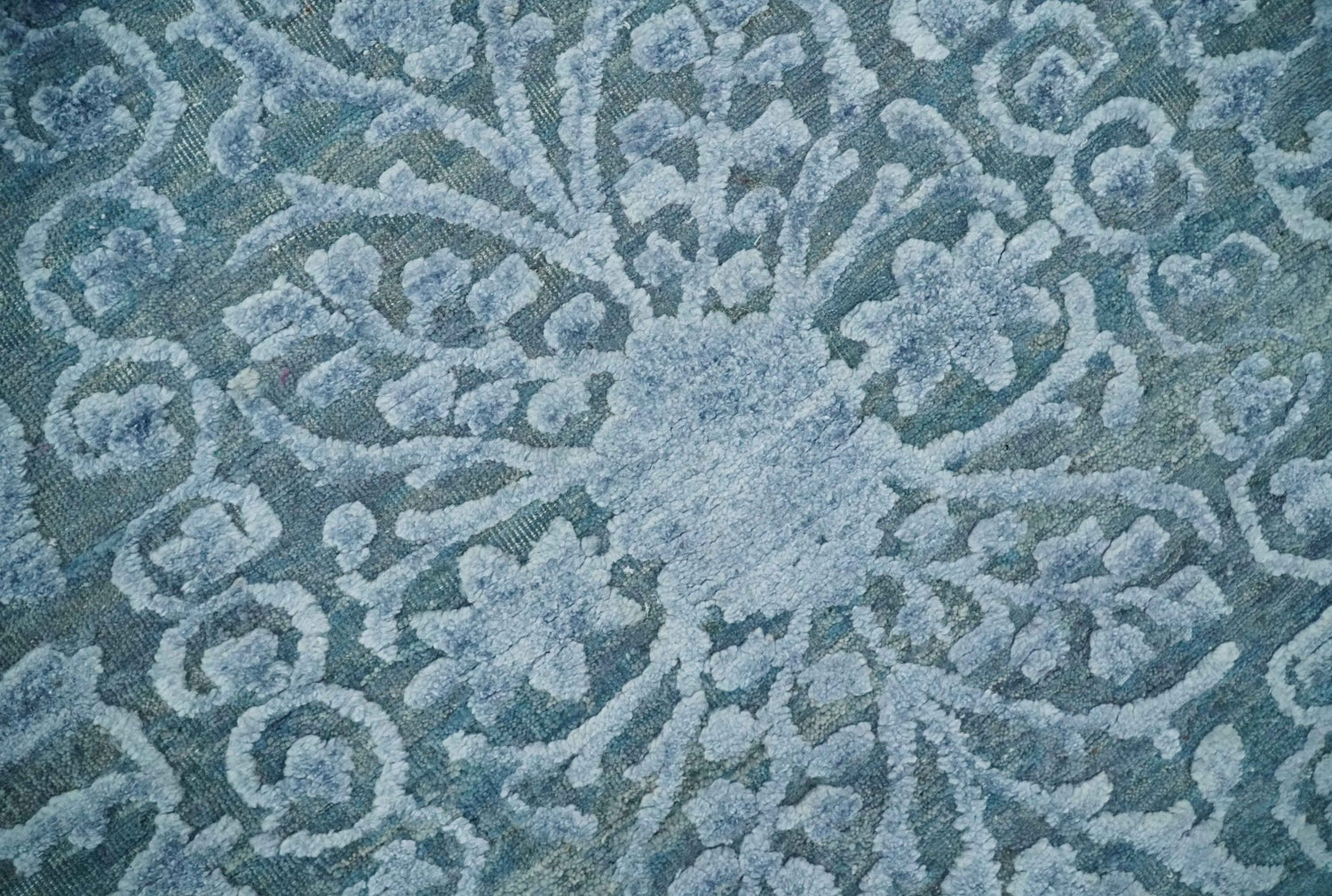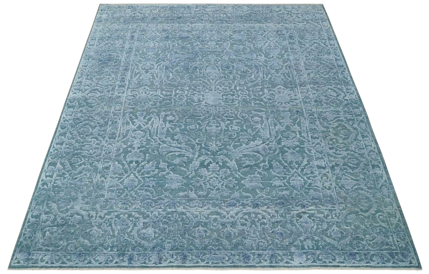 8x9.7 Blue Antique Style, Distressed Finish Hand Carved Traditional Medalian Hand Knotted Wool and Silk Rug