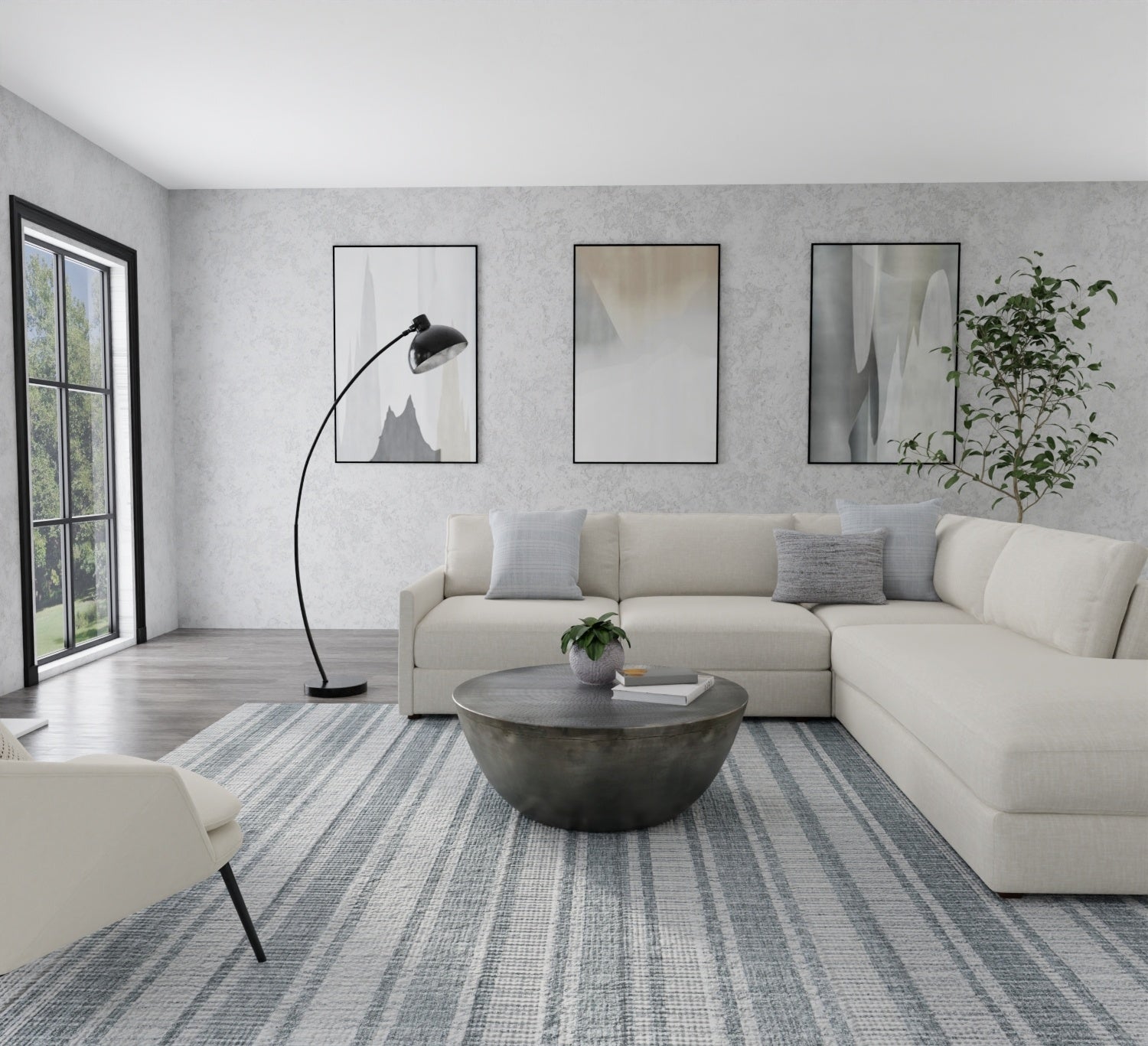 When selecting a living room rug, choose one that anchors your furniture by either placing all the legs on the rug or just the front legs, which helps define the seating area and enhances the room’s acoustics.