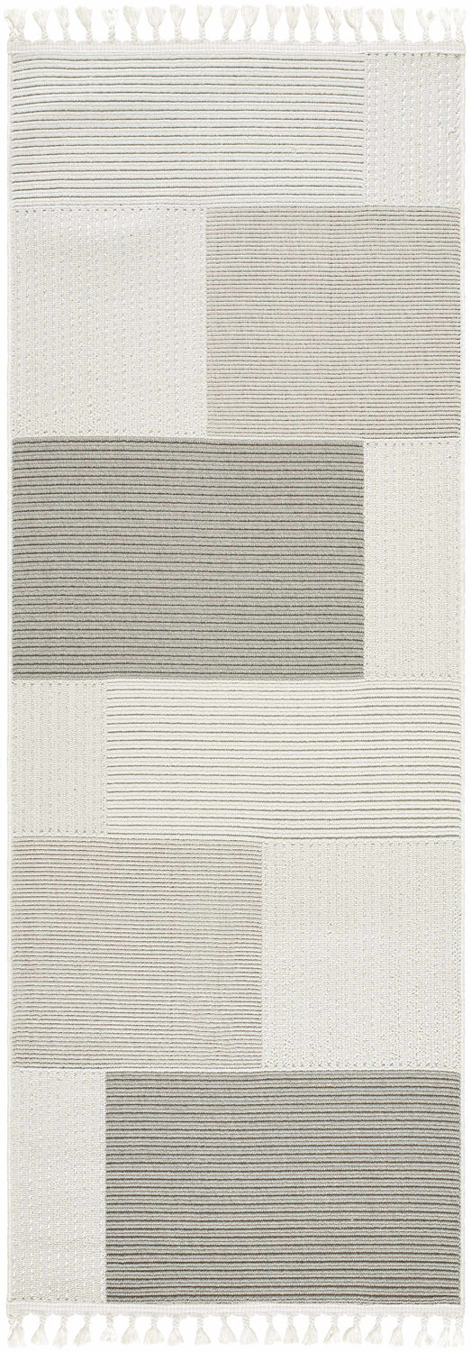 • Close-up of the Rhun Washable Area Rug in off-white, featuring a subtle geometric pattern with horizontal lines and textured bands. Design-Rectangle-537 Neutral nursery with Bone Rhun Washable Area Rug, white crib, beige rocker, and checkered accent wall. Roomscene-Rectangle