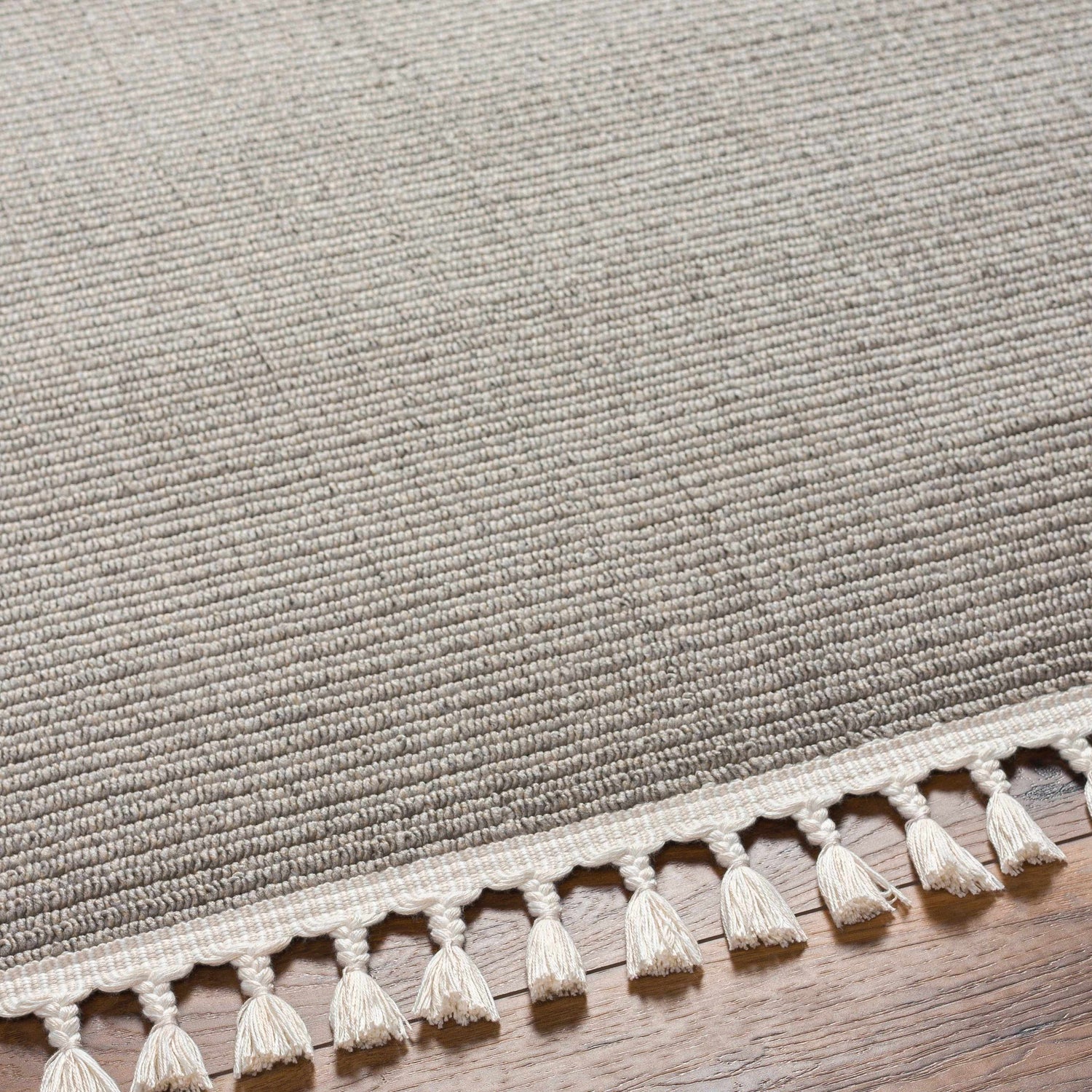 • Close-up of the Hantsport Viscose Area Rug. Hand-woven rug in beige, cream, gray, and tan with a contemporary striped pattern. Design-Rectangle-576 Dining room with a wood table and the light gray striped Hantsport Viscose Area Rug. Roomscene-Rectangle