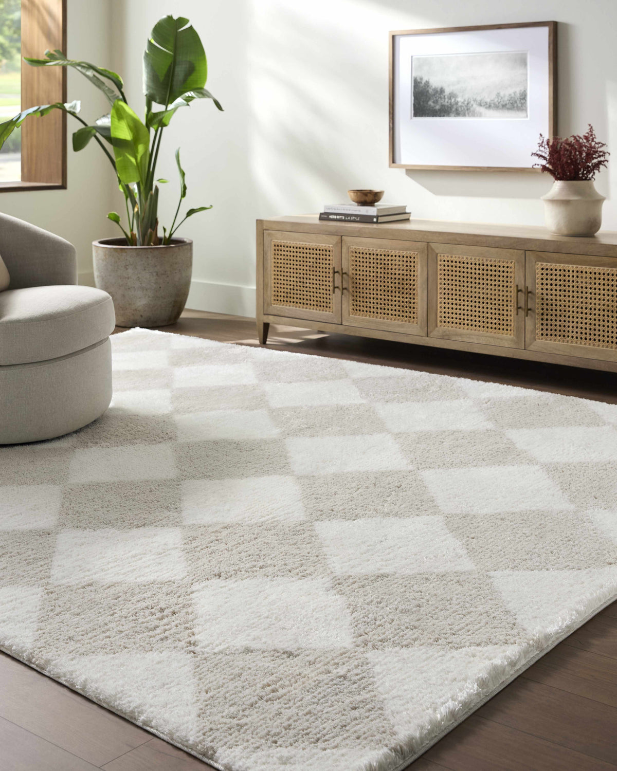When selecting a living room rug, choose one that anchors your furniture by either placing all the legs on the rug or just the front legs, which helps define the seating area and enhances the room’s acoustics.