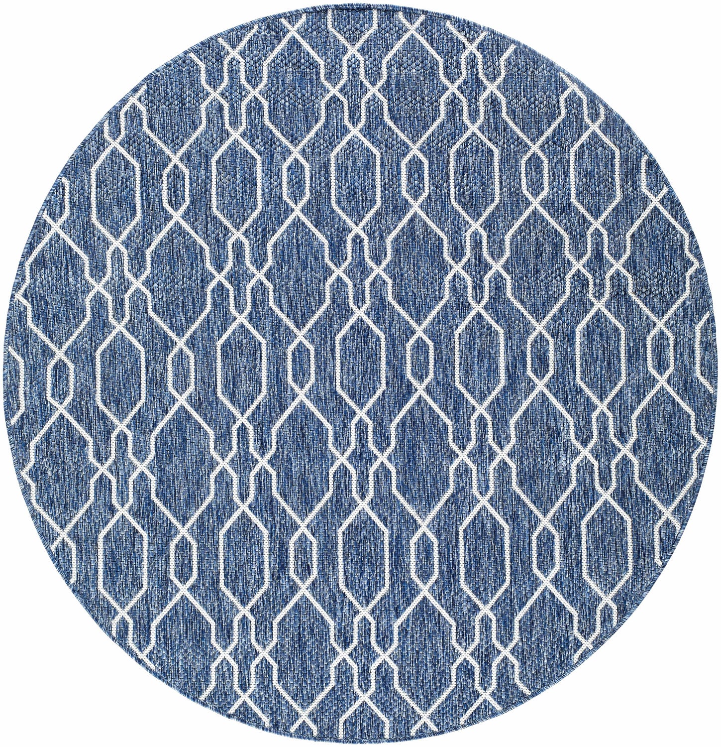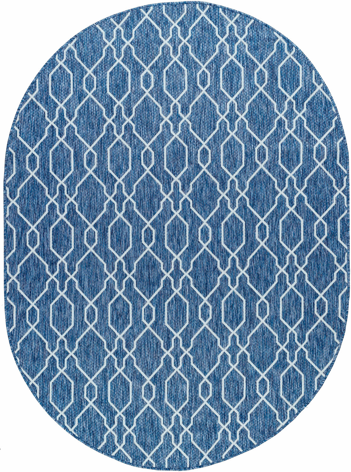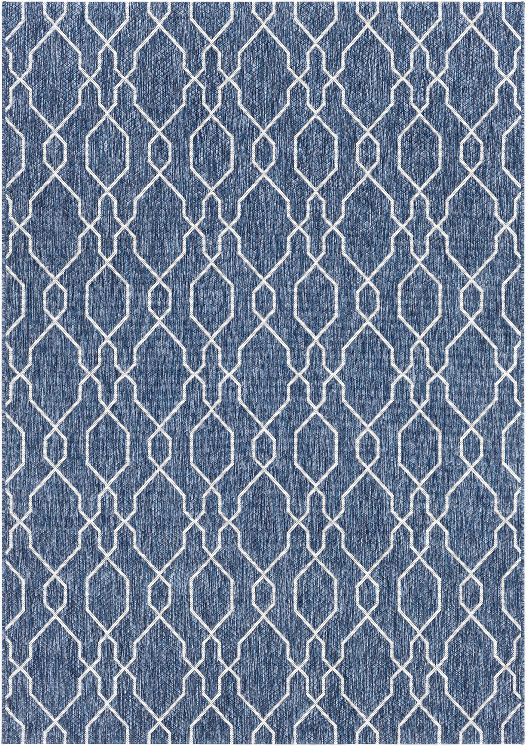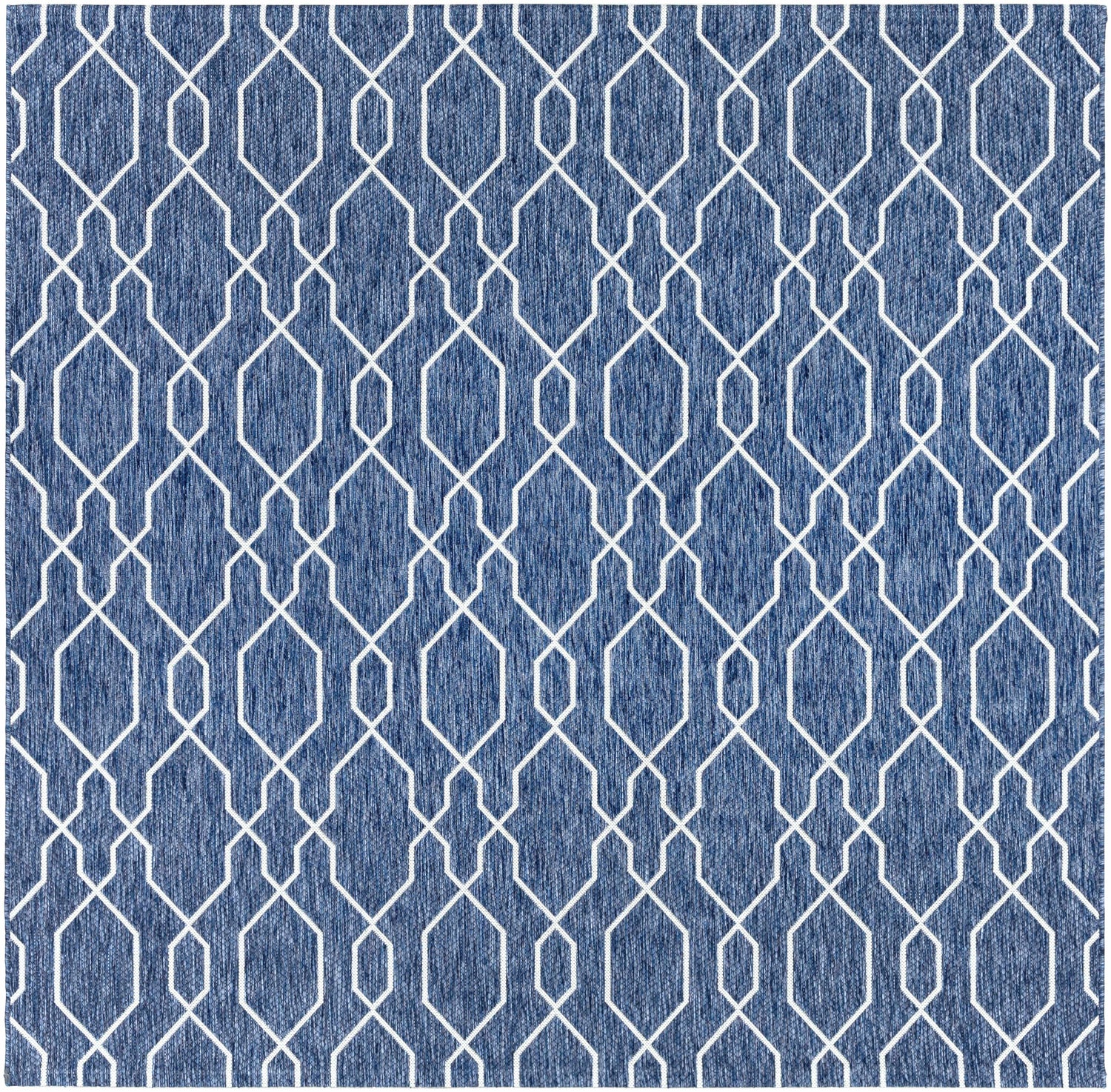 Introducing the Aldford Denim Blue Trellis Outdoor Carpet area rug. This beautiful updated traditional style rug is sure to bring an elegant touch to any room in your home. Expertly crafted from durable polypropylene, it is machine woven in Turkey and is perfect for high traffic areas as it features no pile. It's also outdoor safe, so you can enjoy its beauty all year long! To keep this rug looking like new for years to come, simply hose off with water and hang to dry. For added comfort and protection, pair with a quality rug pad (sold separately). Make the Aldford Denim Blue Trellis Outdoor Carpet area rug yours today!
