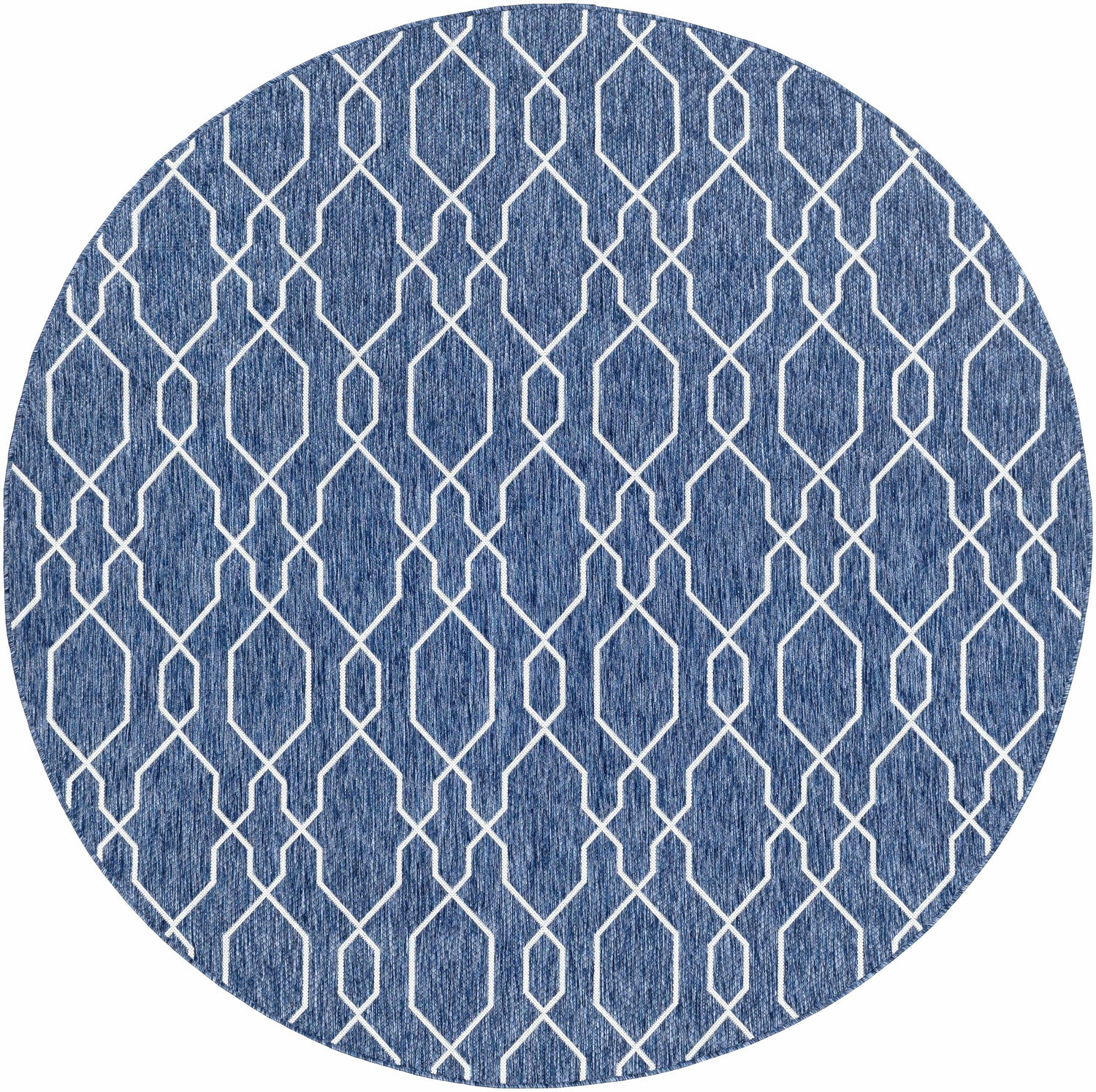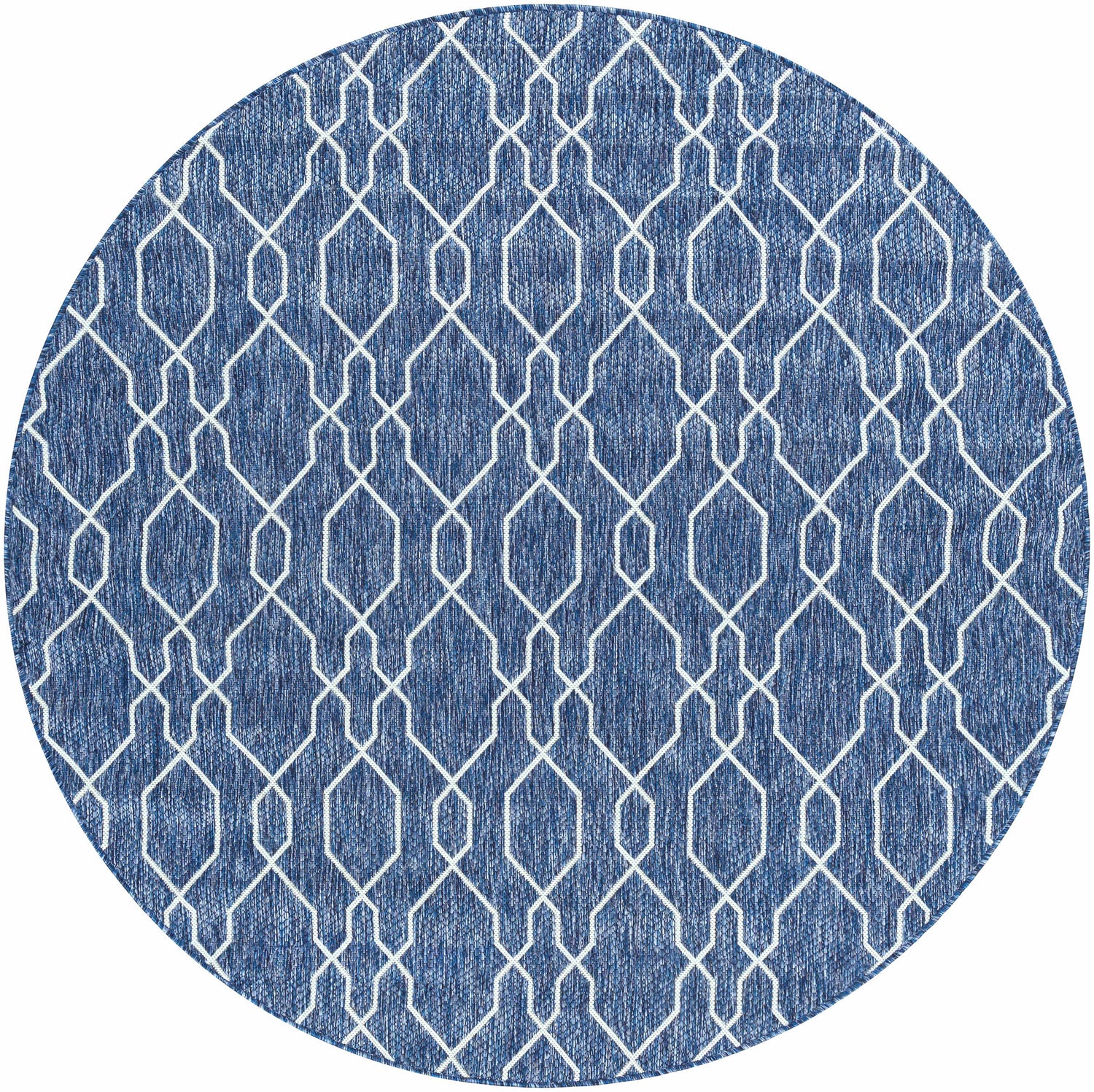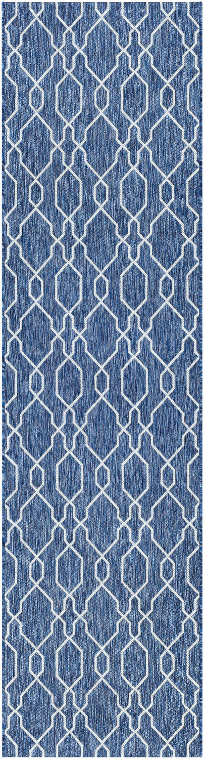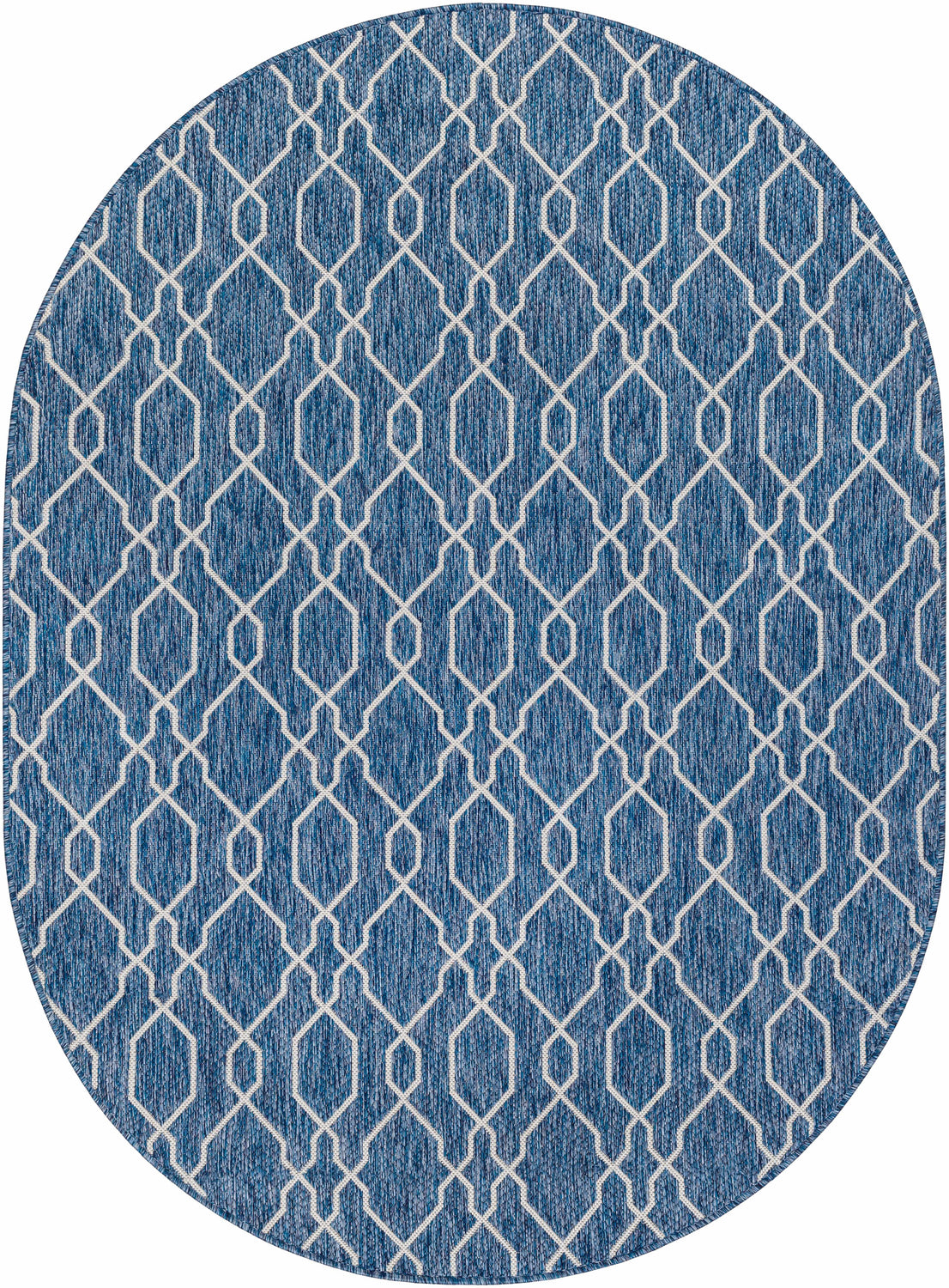 Introducing the Aldford Denim Blue Trellis Outdoor Carpet area rug. This beautiful updated traditional style rug is sure to bring an elegant touch to any room in your home. Expertly crafted from durable polypropylene, it is machine woven in Turkey and is perfect for high traffic areas as it features no pile. It's also outdoor safe, so you can enjoy its beauty all year long! To keep this rug looking like new for years to come, simply hose off with water and hang to dry. For added comfort and protection, pair with a quality rug pad (sold separately). Make the Aldford Denim Blue Trellis Outdoor Carpet area rug yours today!