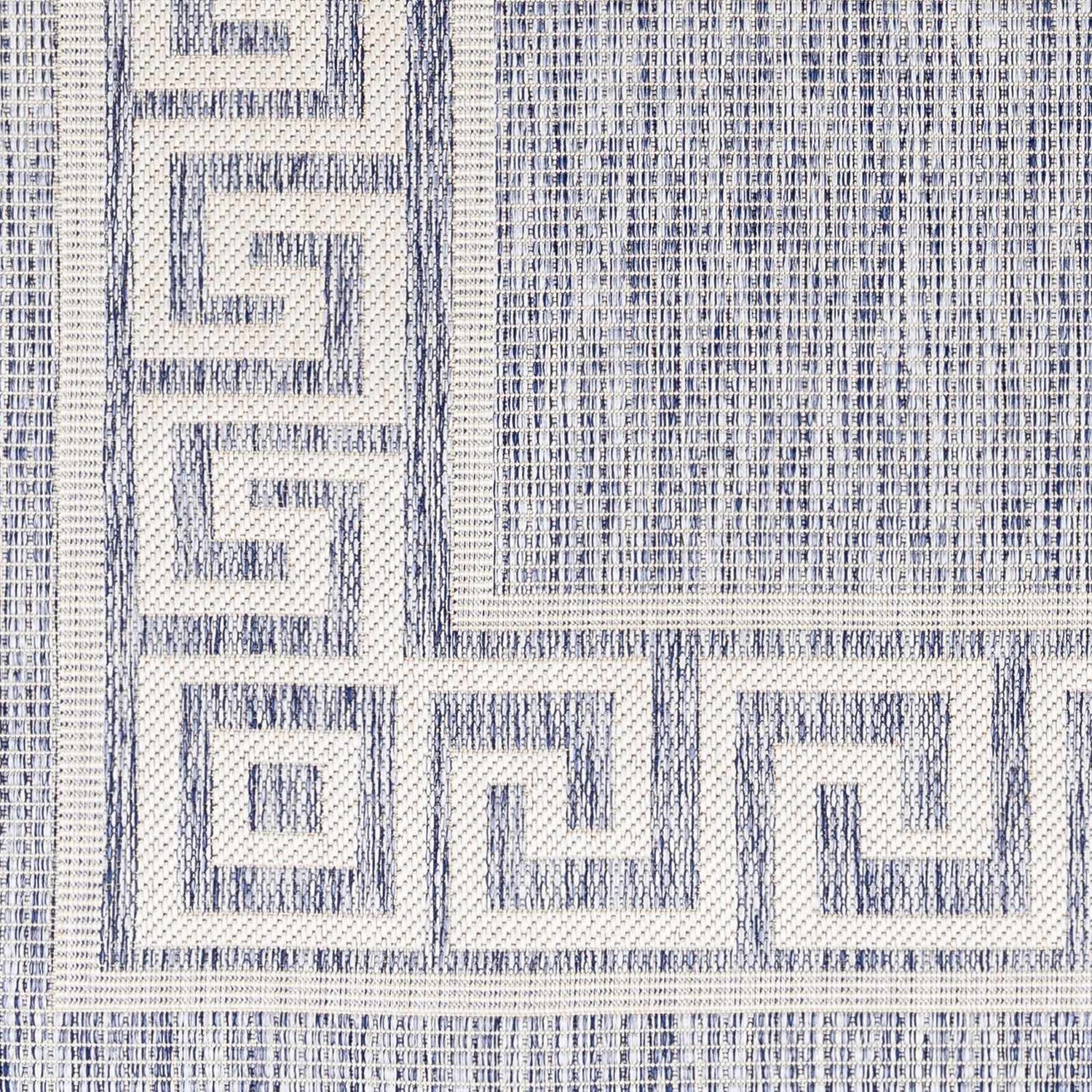 A crisp blue field framed by a classic cream Greek key border — this durable polypropylene rug goes from patio to living room without skipping a beat.