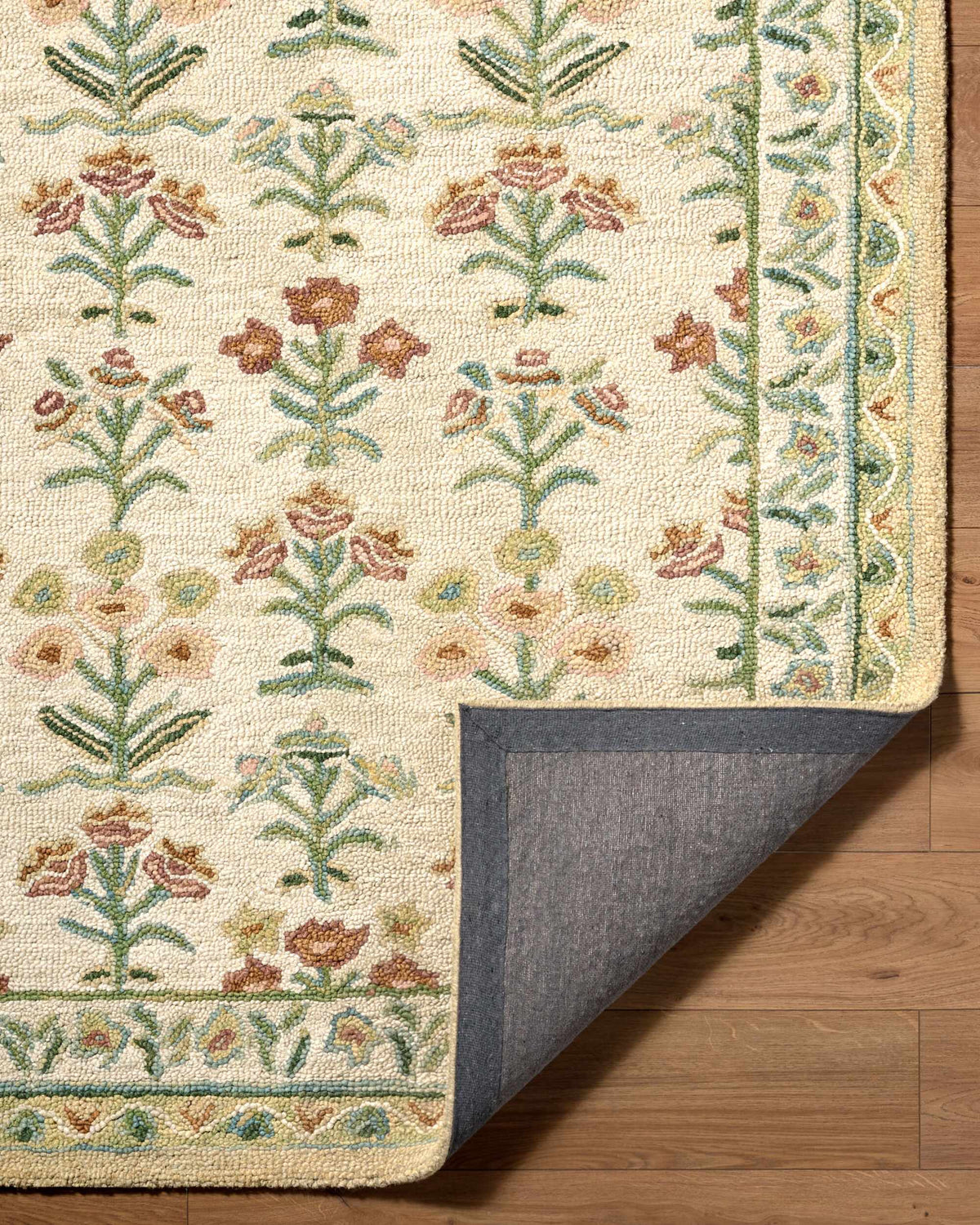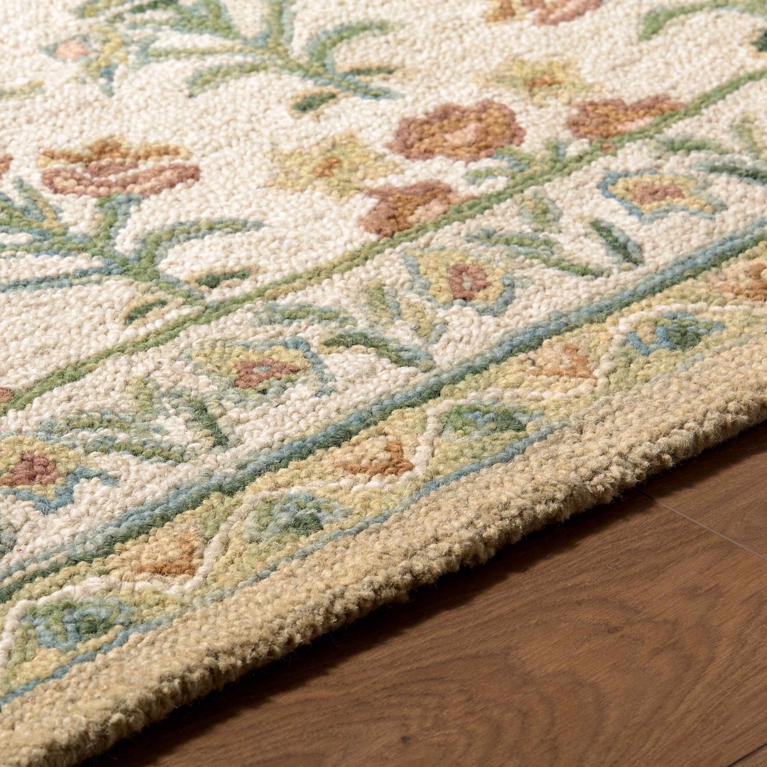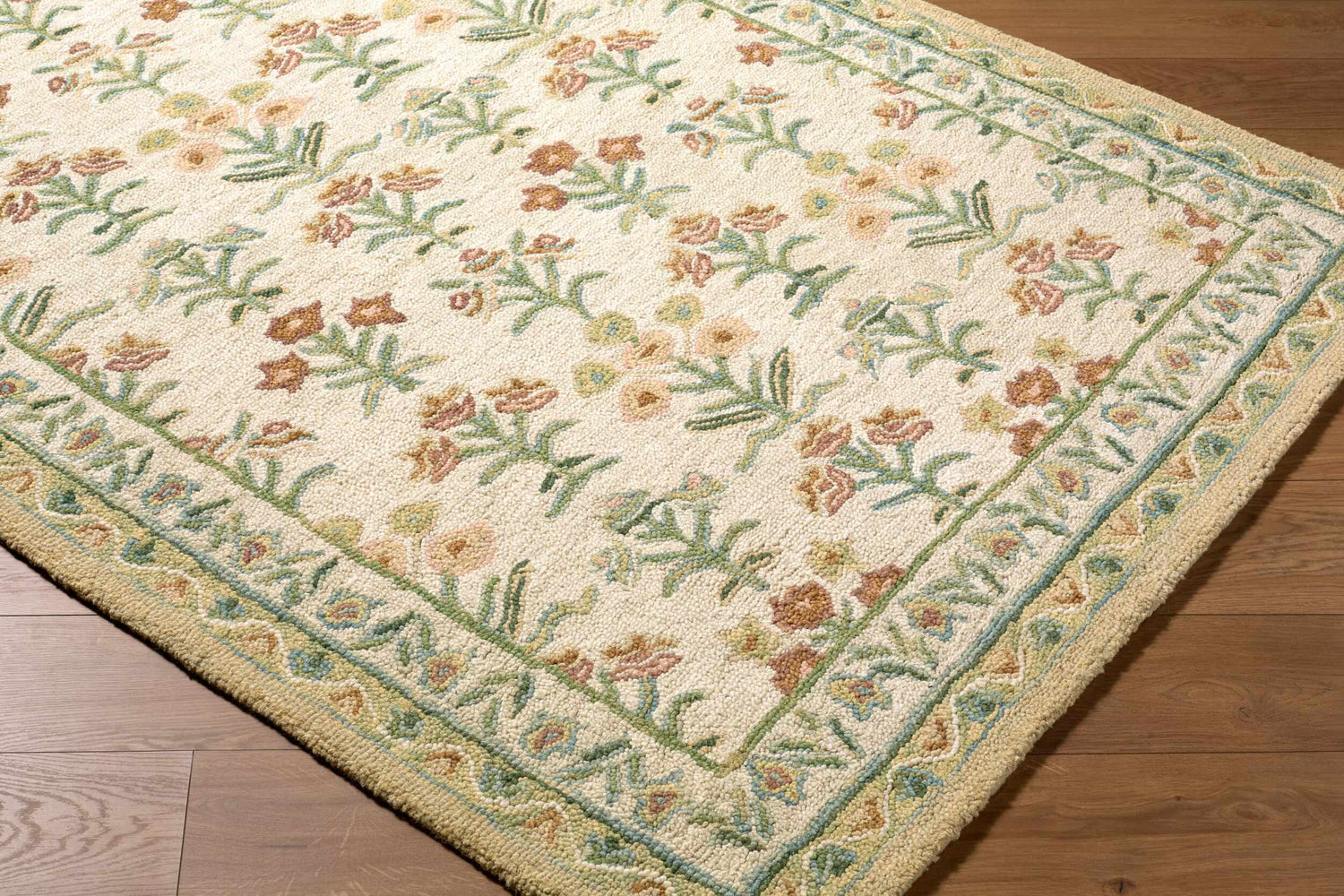 A handmade wool rug with a soft ivory ground and delicate botanical floral pattern — sage green stems, warm orange blooms, and a classic border that feels like a garden in full bloom.