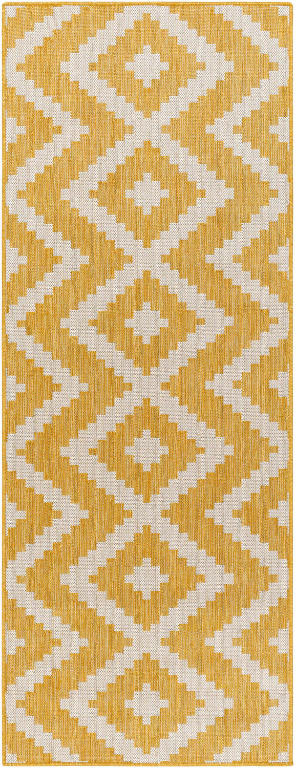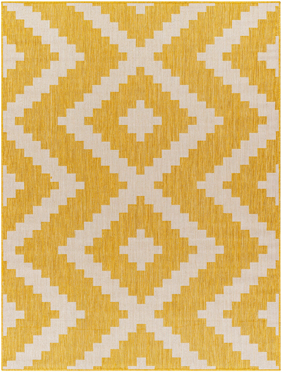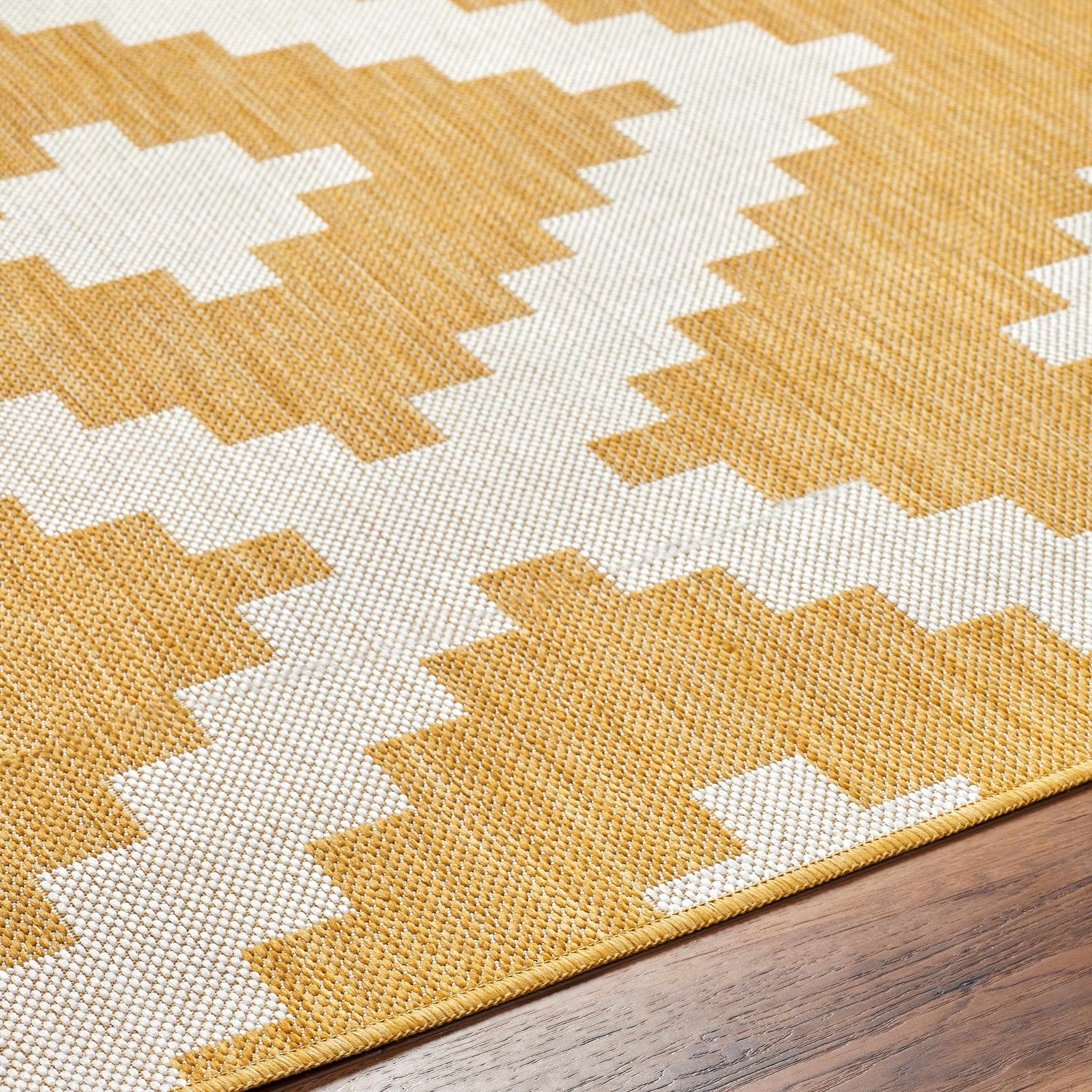 A bold mustard yellow tribal diamond pattern that works indoors and out — stain resistant, pet friendly, and built to handle real life without sacrificing style.