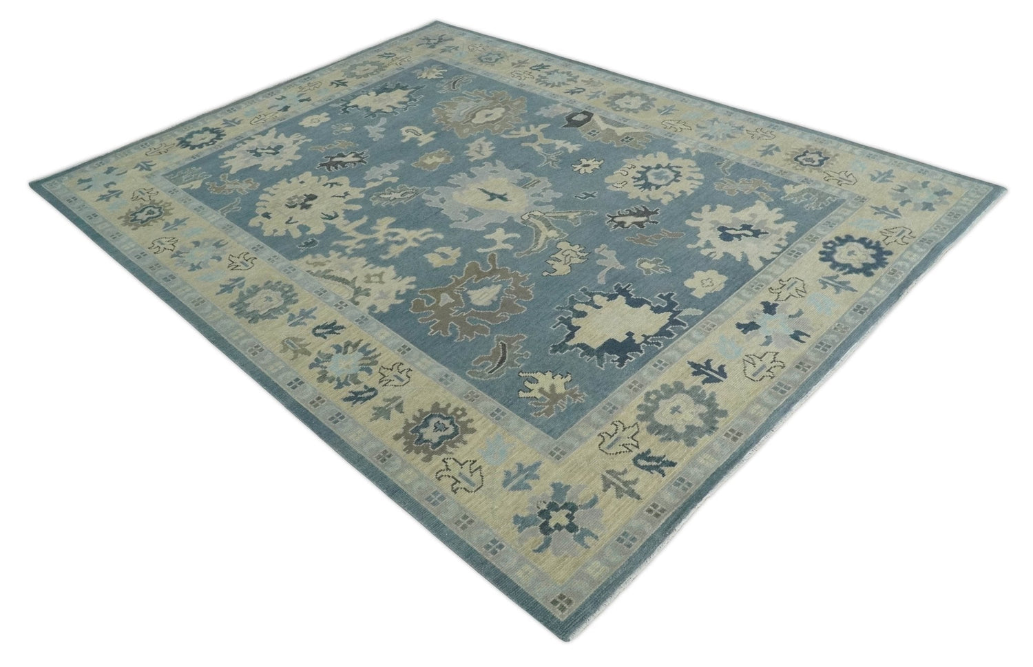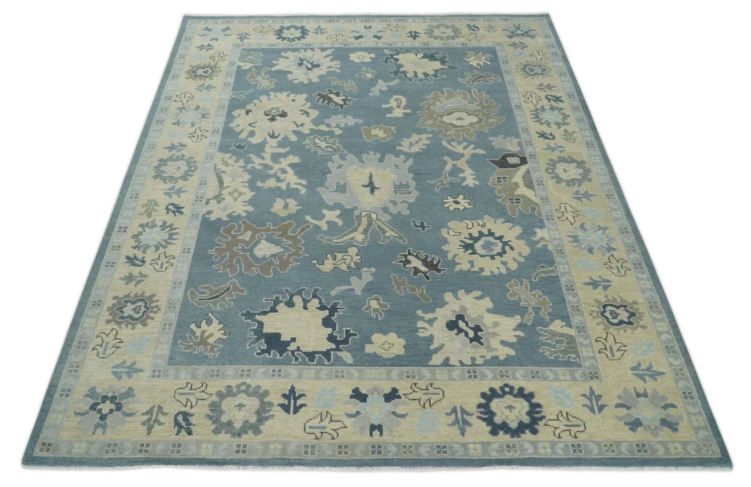 This elegant Oushak wool area rug is beautifully hand-knotted in a traditional style, crafted with a unique antique blue and beige pattern in multiple sizes. The high-quality wool construction is soft and durable, making this an ideal decoration for residential and commercial spaces.