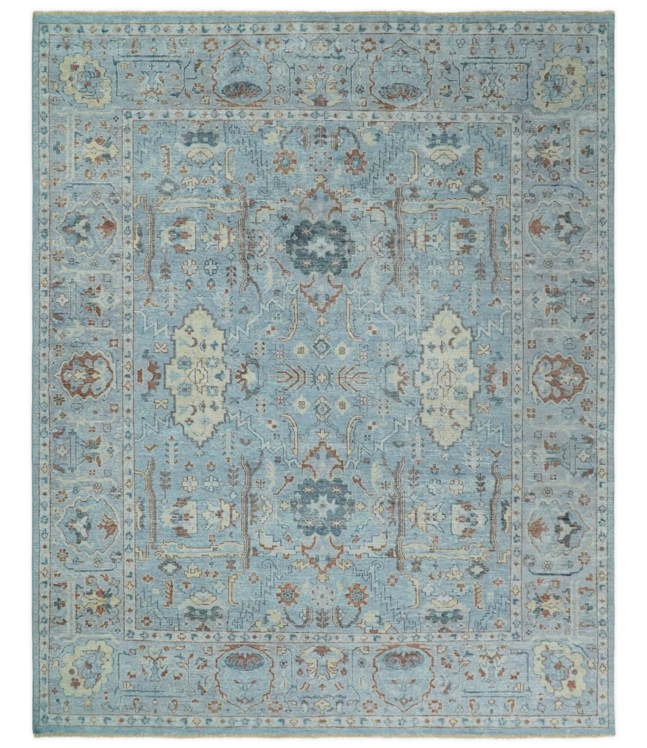 Expertly hand-knotted from premium wool, this Oriental Oushak rug boasts a low pile design that both showcases and preserves its striking aqua, beige, and brown color scheme. Its antique distressed finish adds a touch of vintage charm. Available in multiple sizes for versatility and timeless style.