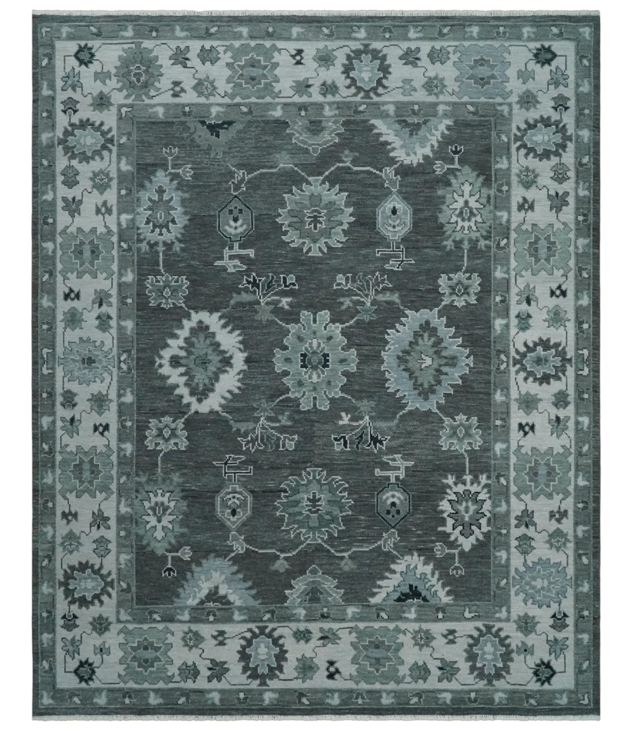 Antique Hand Knotted Charcoal and Ivory Traditional Oushak Wool Area Rug