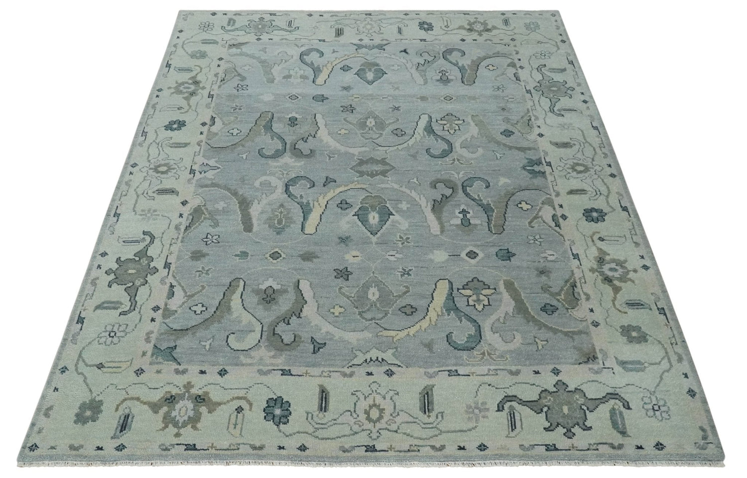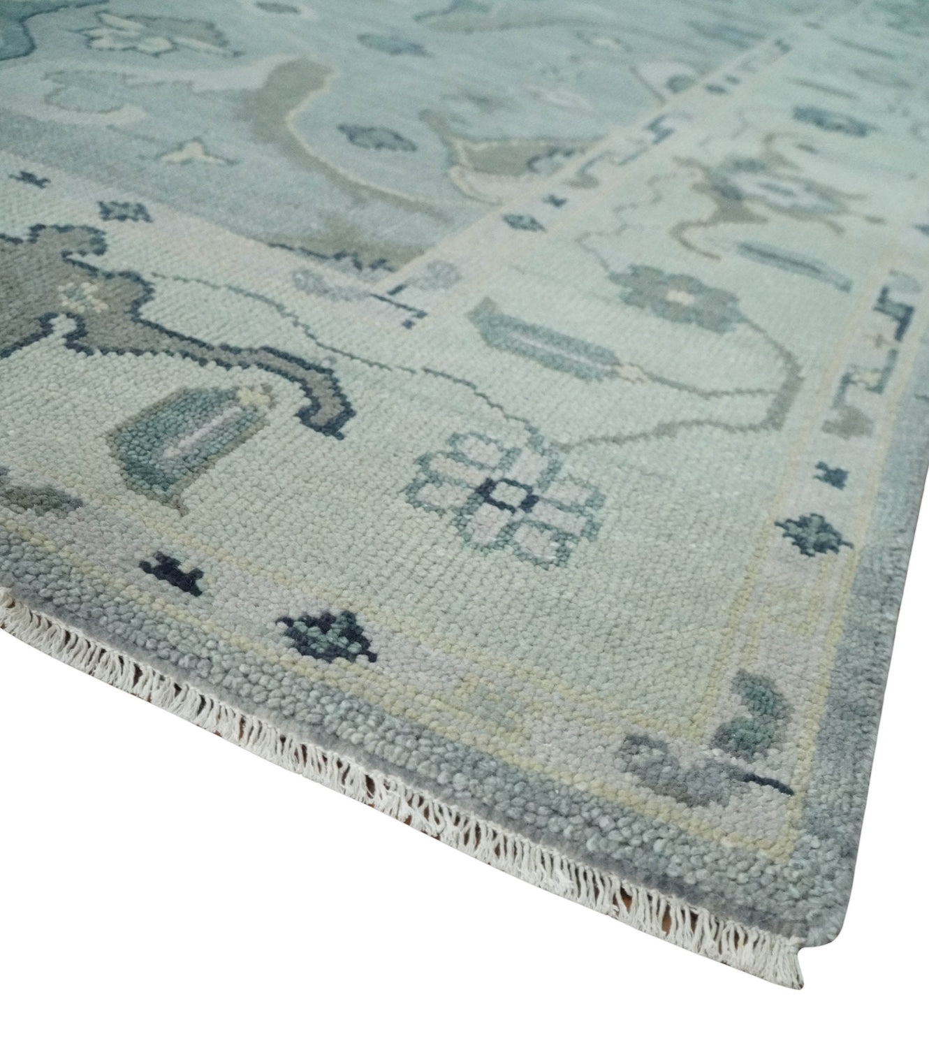 Antique Style Custom Made Charcoal, Silver and Green Hand Knotted Oriental Oushak Wool Area Rug