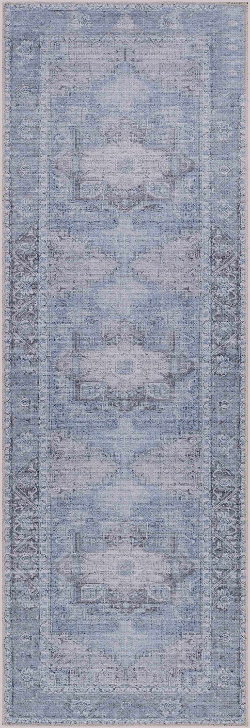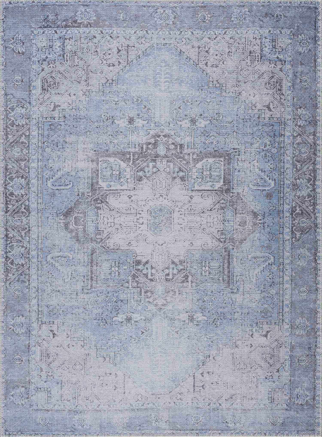 Create a timeless look in your home with the Ice Blue Nisa Washable Area Rug. This updated traditional style rug is crafted from chenille-polyester and cotton for a durable, long-lasting piece. It features a machine woven construction and no pile so it's perfect for high traffic areas in your home. Plus, this Turkish made rug is easy to care for - just machine wash cold on delicate cycle, line dry and enjoy its effortless beauty! For added comfort, use with a rug pad (not included).