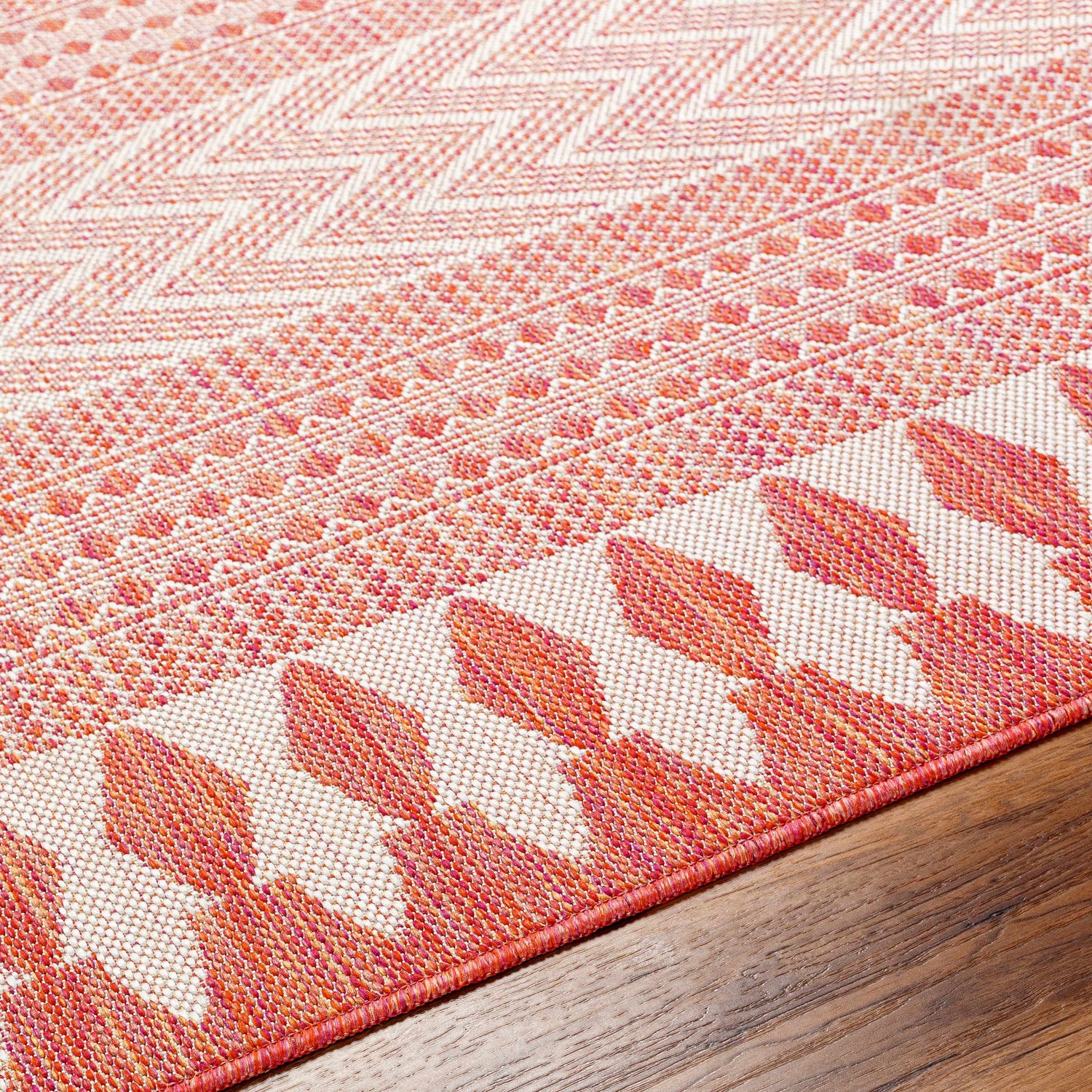 - Bold Moroccan geometric pattern in warm orange, coral & cream