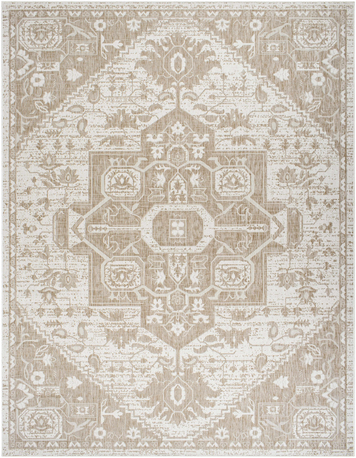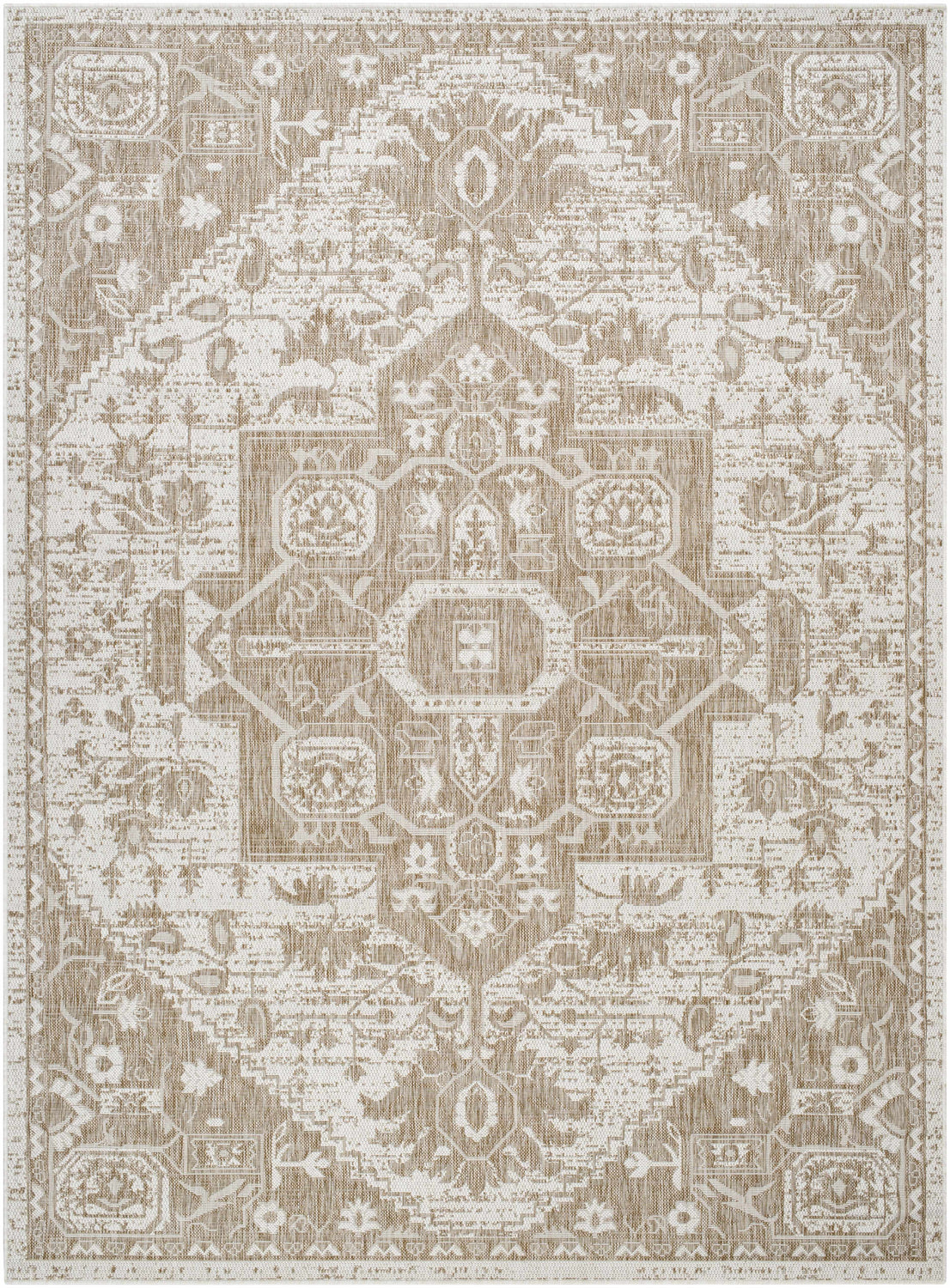 Create a timeless look in your home with the Aure Area Rug. This classic Updated Traditional style rug is machine woven of polypropylene, making it durable and long lasting. The unique no-pile design makes it perfect for high traffic areas and is even outdoor safe. With its intricate pattern, this rug will add a touch of sophistication to any room. Plus, the simple care instructions make maintenance easy - just hose off with water and hang to dry!