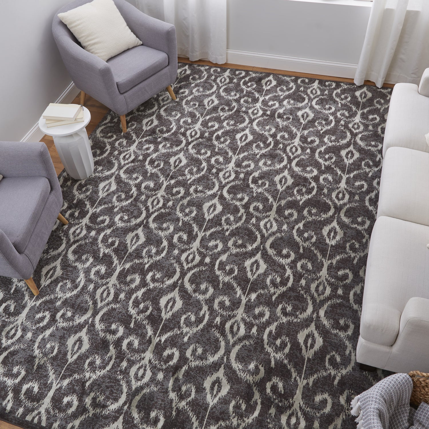 When selecting a living room rug, choose one that anchors your furniture by either placing all the legs on the rug or just the front legs, which helps define the seating area and enhances the room’s acoustics.