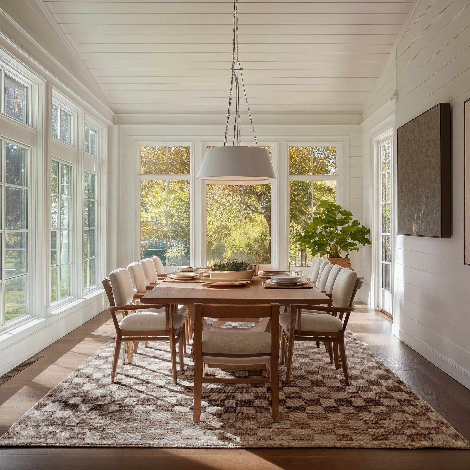 When selecting a dining room rug, choose one large enough to fit under the table and chairs, ensuring that when the chairs are pulled out, they remain on the rug for a balanced look.