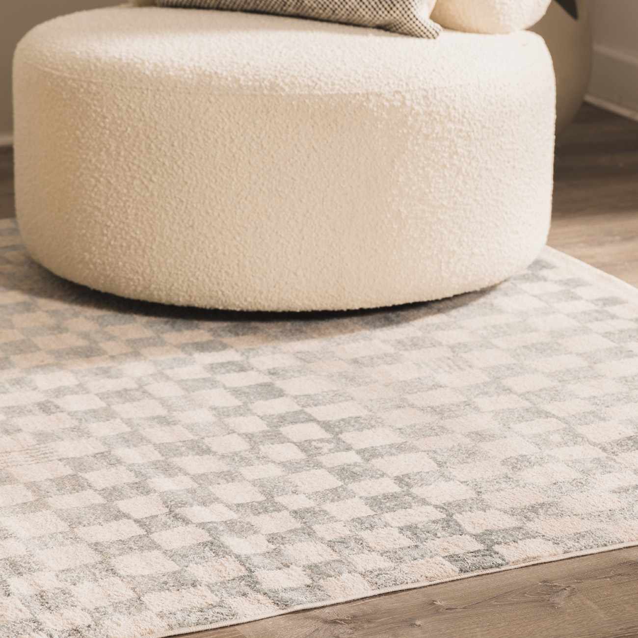 A soft cream and light blue checkerboard rug with a handcrafted, textured look — modern enough for any room, timeless enough to keep forever.