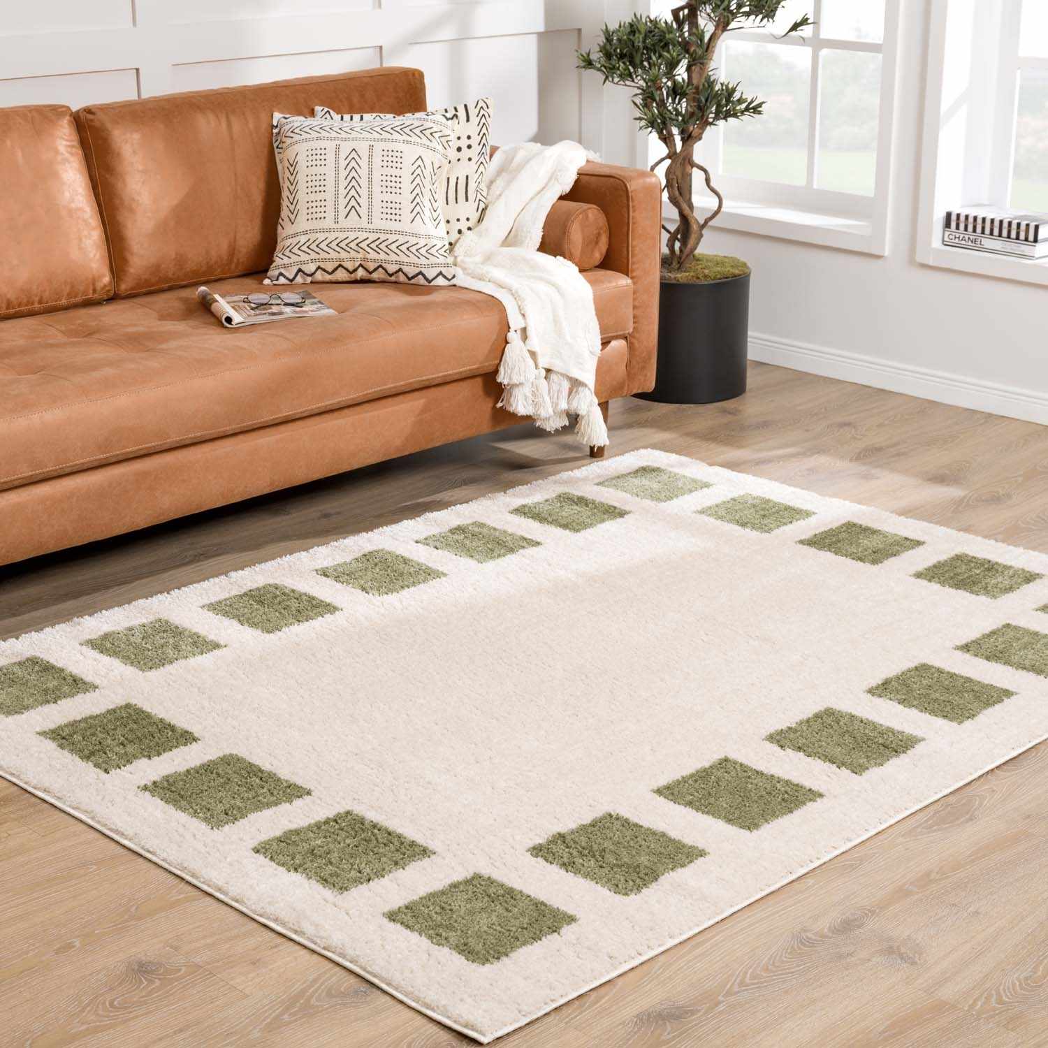 When selecting a living room rug, choose one that anchors your furniture by either placing all the legs on the rug or just the front legs, which helps define the seating area and enhances the room’s acoustics.
