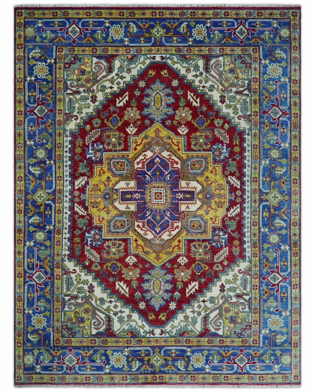 Blue, Maroon and Gold Hand Knotted Traditional Heriz Serapi Multi size Wool Area Rug