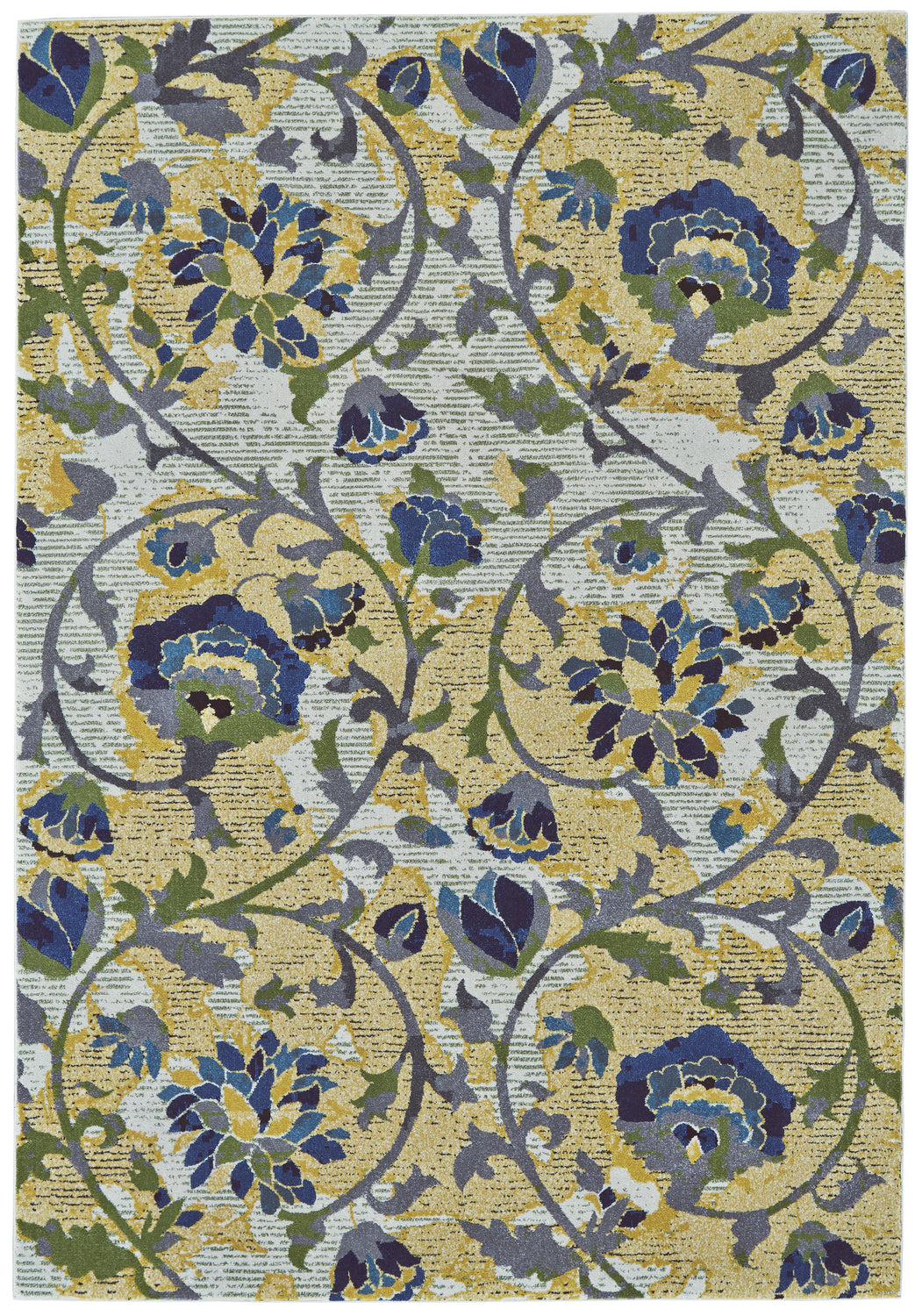 A rectangular area rug with an ivory and warm golden-yellow ground, covered allover in a sweeping floral scroll pattern. Large, fully-bloomed flowers in deep cobalt blue and navy are connected by curving vine scrollwork in sage green and olive, with gray-toned shadow leaves adding depth. The blooms vary in size and are distributed across the entire surface with no central medallion — the pattern repeats in a flowing, organic layout. The pile is low and smooth with a machine-woven texture. Edges are cleanly bound with no fringe or tassels. The overall impression is lush, colorful, and garden-inspired — a traditional floral motif rendered in a vivid, painterly palette.