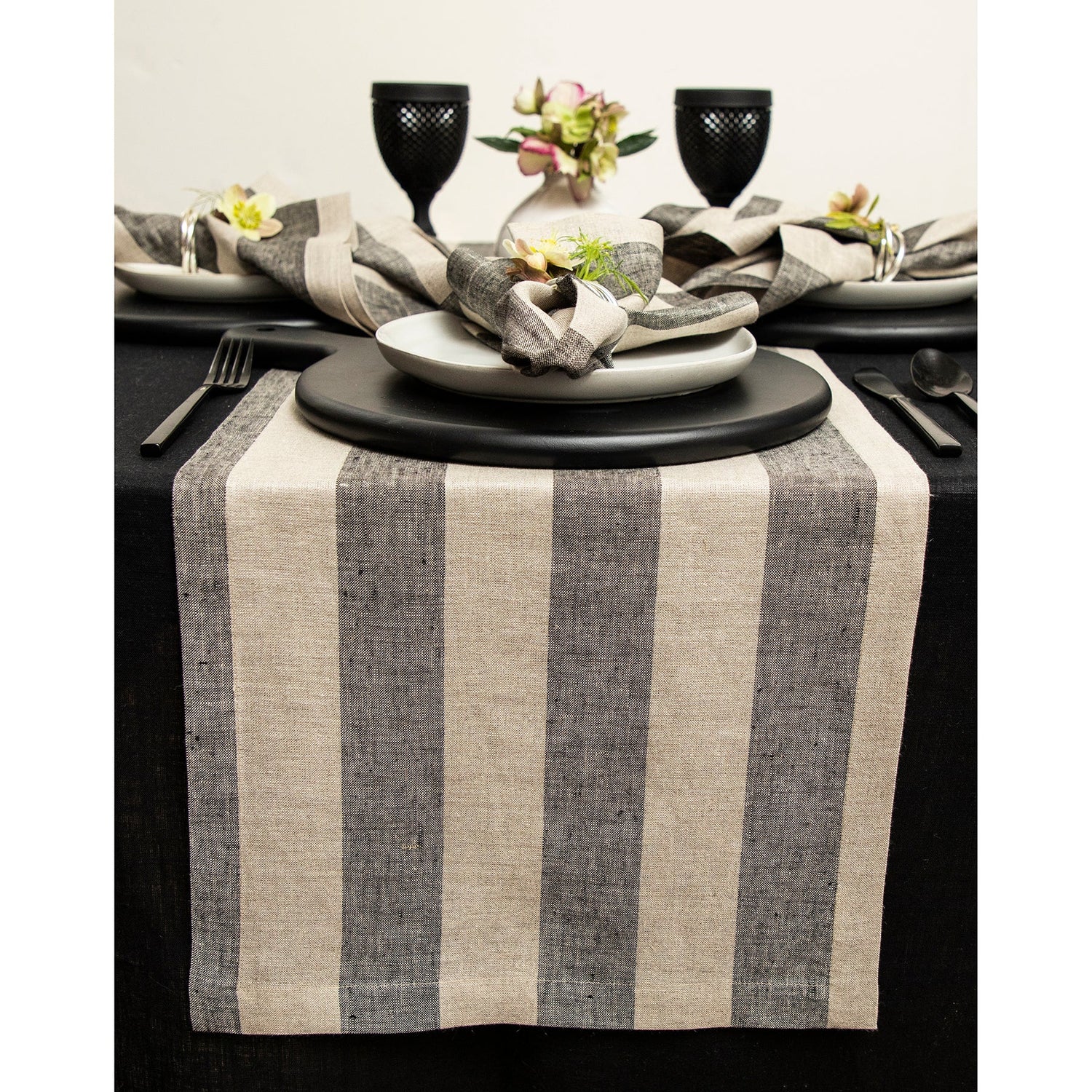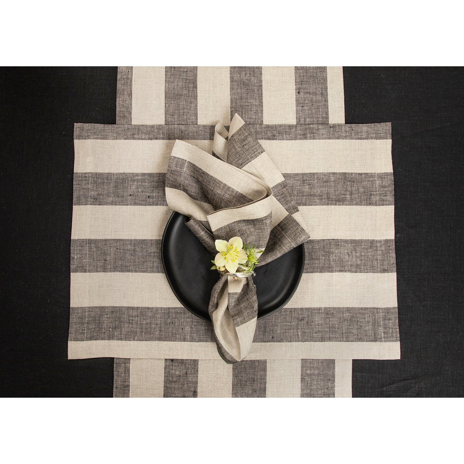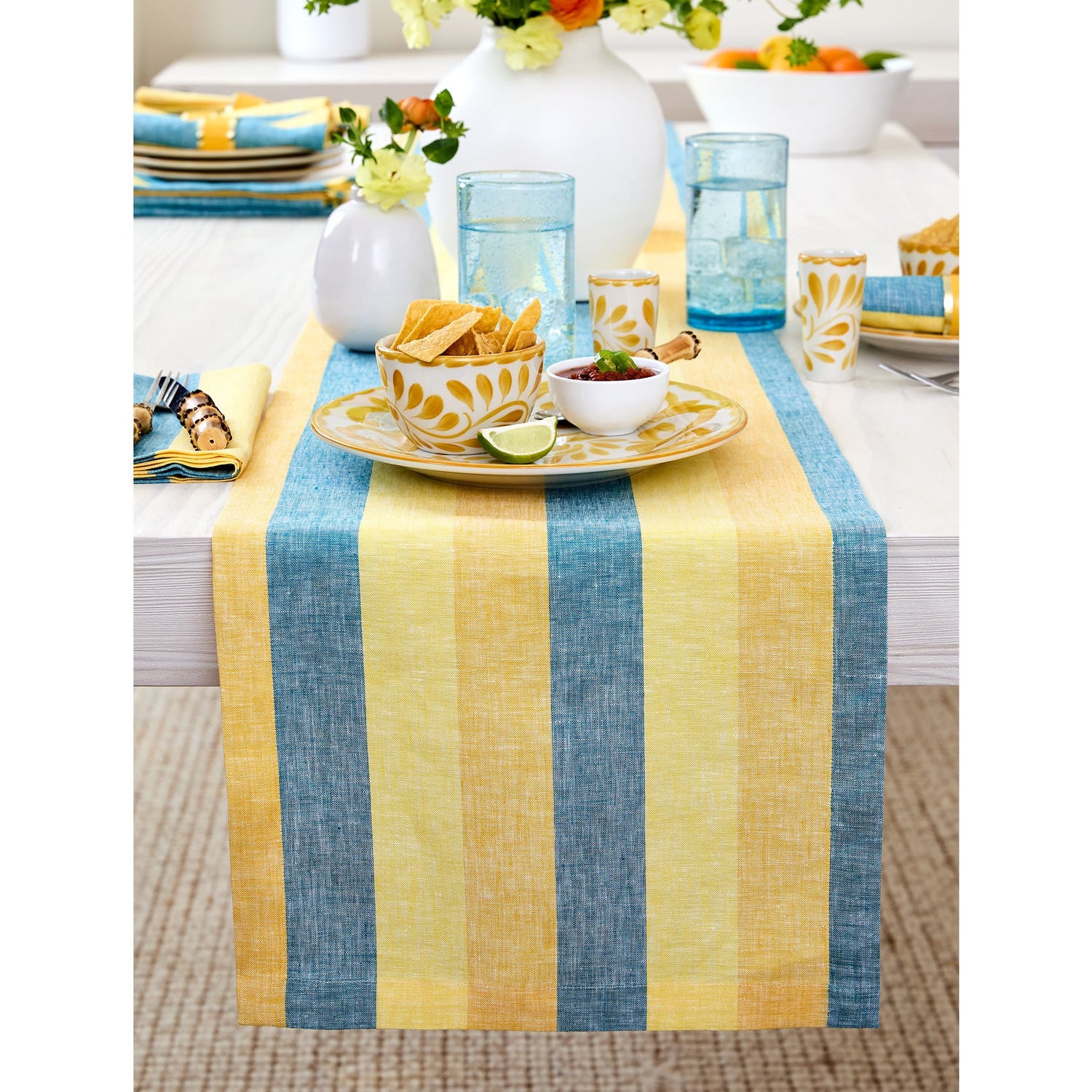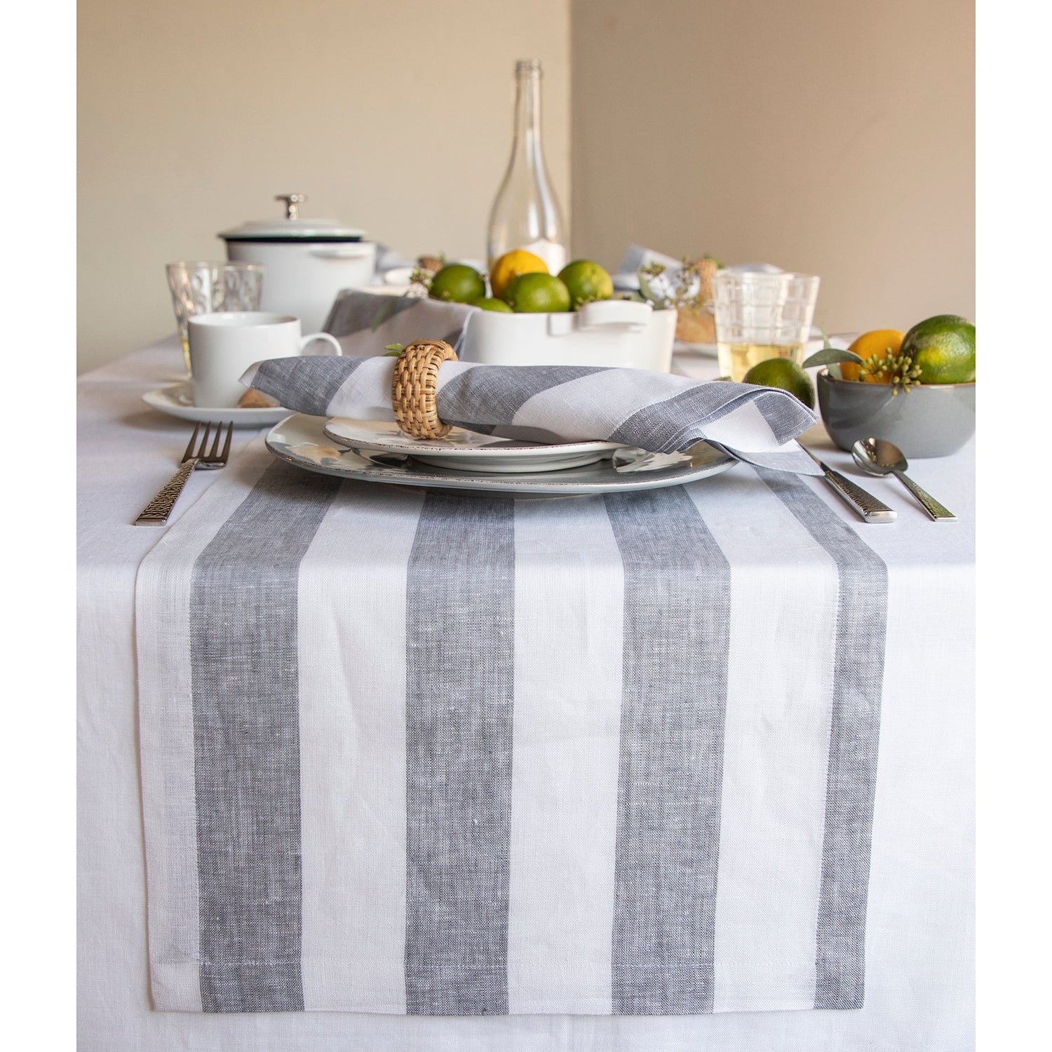 Think al fresco dining, small dinner parties around the pool or a casual Sunday brunch. Enters: Our Cabana Stripe Collection. We're bringing this big, bold and classic awning stripe to the table with this crisp stripe collection. Beautifully woven with 100% pure linen by skilled artisans, the stripe design of our Table Runners, Placemats, Napkins and Curtains provides a timeless collection that pairs well on the table with your favorite dinnerware, flatware and glassware or the leather couch in the office or study.