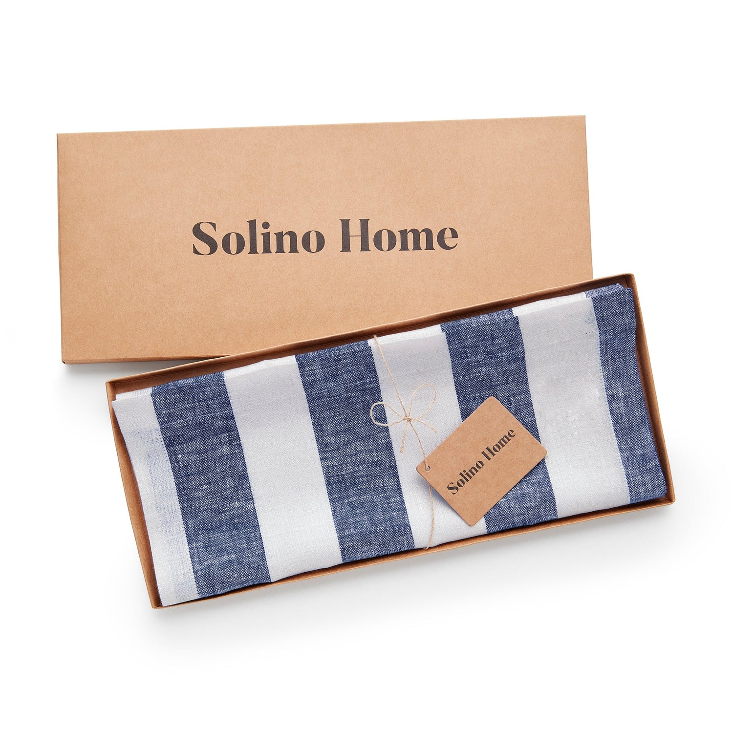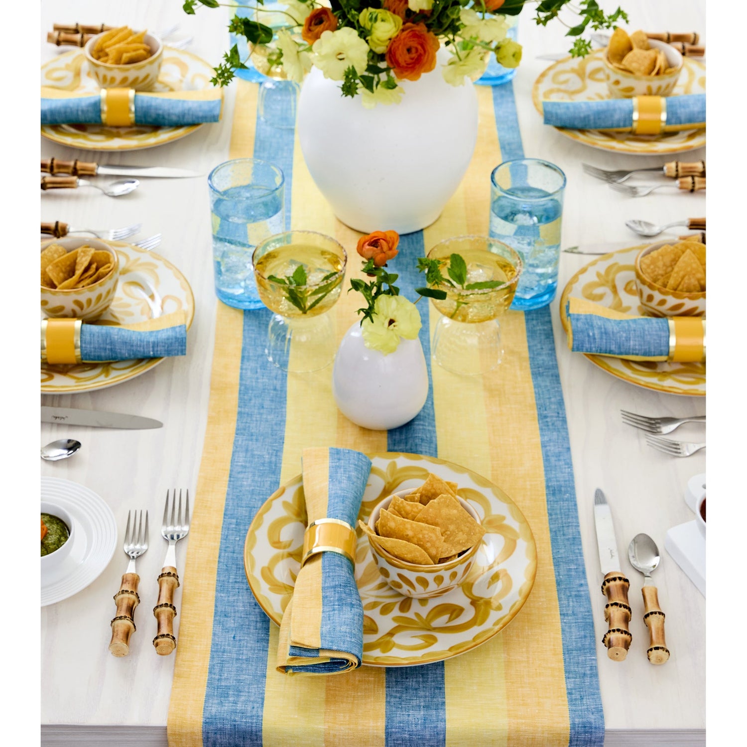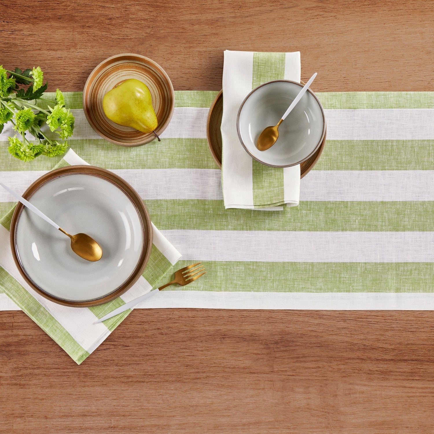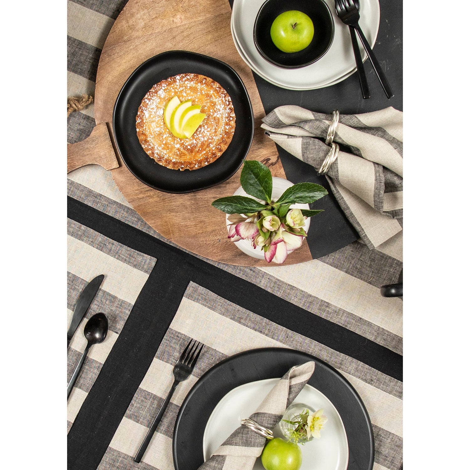 Think al fresco dining, small dinner parties around the pool or a casual Sunday brunch. Enters: Our Cabana Stripe Collection. We're bringing this big, bold and classic awning stripe to the table with this crisp stripe collection. Beautifully woven with 100% pure linen by skilled artisans, the stripe design of our Table Runners, Placemats, Napkins and Curtains provides a timeless collection that pairs well on the table with your favorite dinnerware, flatware and glassware or the leather couch in the office or study.