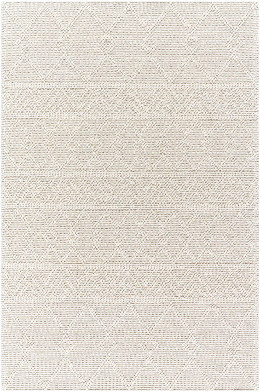 Step into comfort and style with the Caelum White Wool-Blend Rug Collection hand-made rug. Boasting a Bohemian Global flair, this rug is an exquisite blend of polyester and wool, hand-woven in India to ensure a unique, charming piece for your space. Despite its rich texture, it features no pile which means no shedding or thinning over time. For optimal use and longevity, we recommend pairing this rug with a pad. Should any spills occur, worry not - just spot clean with water! Bring home this touch of elegance and warmth today!