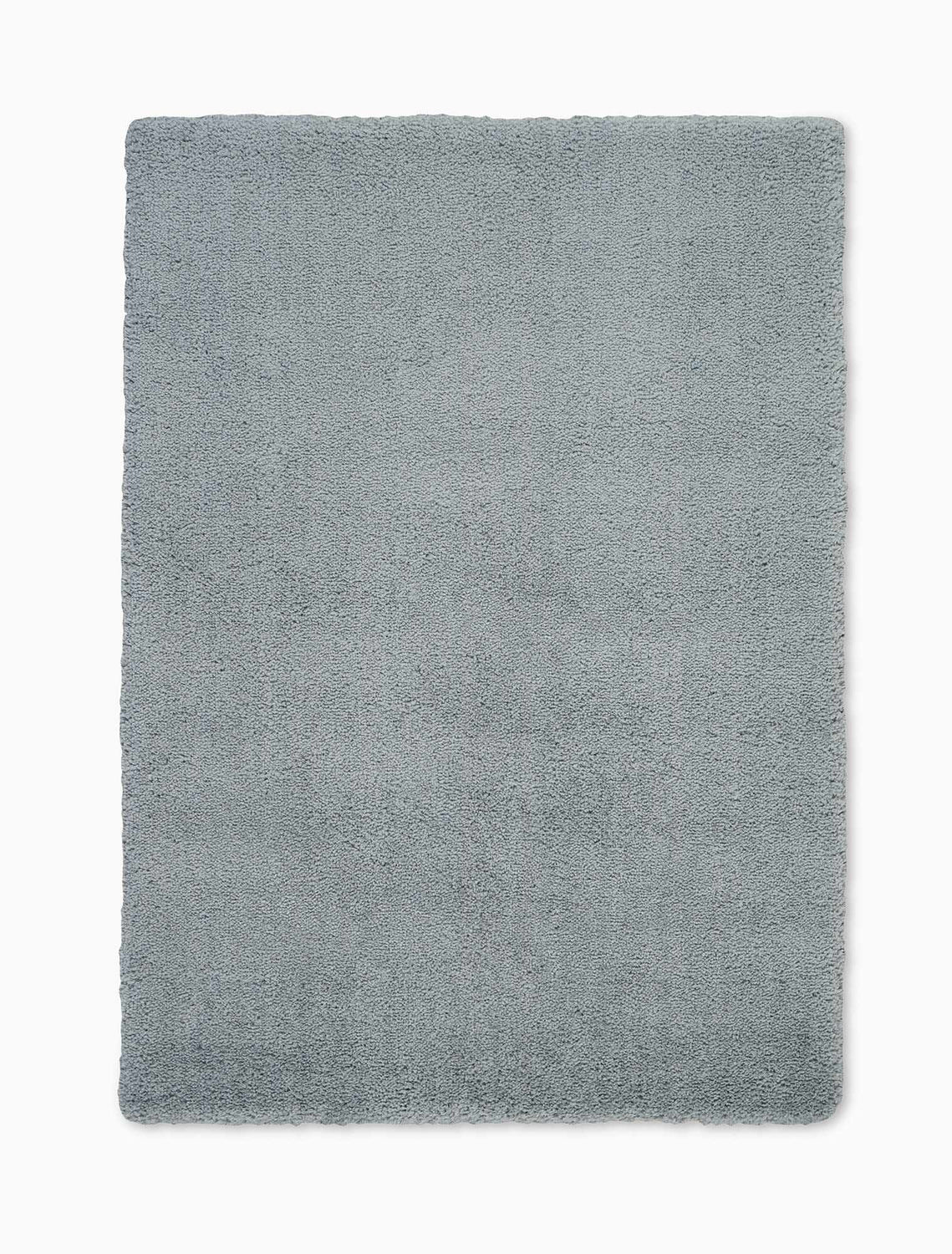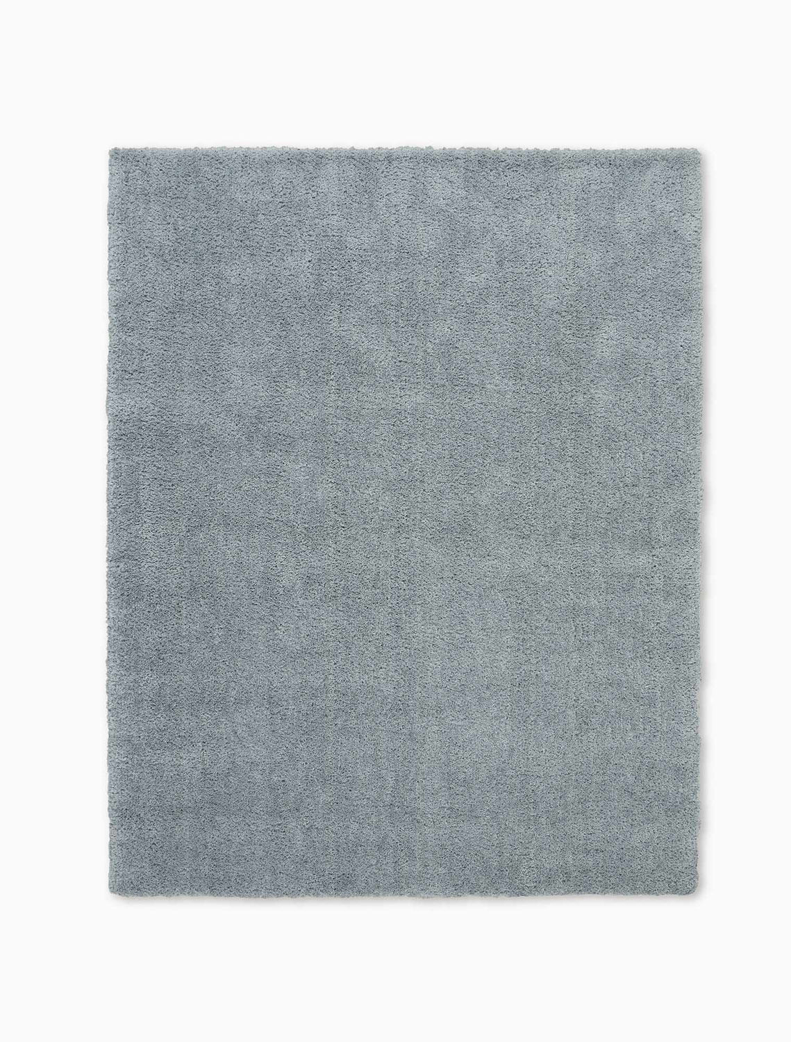 A solid, uniformly colored rectangular shag rug in a muted blue-gray tone — somewhere between cool medium gray and soft slate blue. The entire surface is covered in a dense, evenly distributed cut pile approximately 1.5 inches tall, giving it a thick, fluffy, cloud-like texture with a slightly directional nap visible in the photo. There is no pattern, no border, and no fringe — just a clean expanse of plush pile with neatly bound edges all around. The color is consistent across the entire surface with very subtle tonal variation from light catching the pile at different angles. The overall impression is of a luxuriously soft, modern, understated rug.