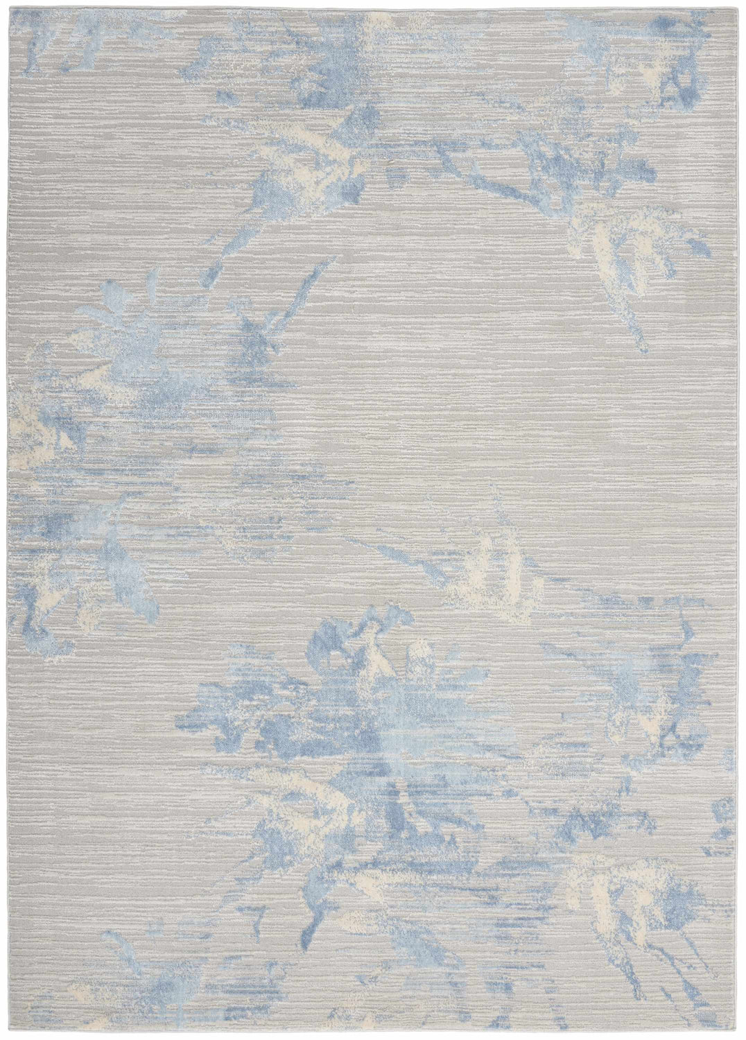 cool paletteA cool, airy palette of soft silver-gray dominates the field, with expressive sky blue and pale cream abstract washes drifting across the surface — like watercolor clouds caught mid-movement, giving the whole rug a calm, atmospheric quality.