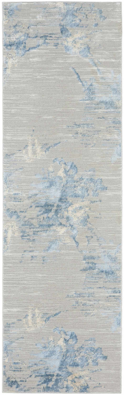 A rectangular runner-proportioned rug with a soft silver-gray base field and expressive abstract brushstroke patterns in sky blue, pale cream, and deeper slate blue distributed across the surface in an organic, cloud-like arrangement. The pattern has a watercolor or ink-wash quality — fluid and asymmetrical, with no hard edges or repeating geometric structure. The pile is low and smooth with a subtle linear texture visible in the weave. Edges are cleanly bound with no fringe or tassels. The overall impression is of a calm, painterly abstraction — sophisticated and airy, like a modern art canvas laid flat on the floor.