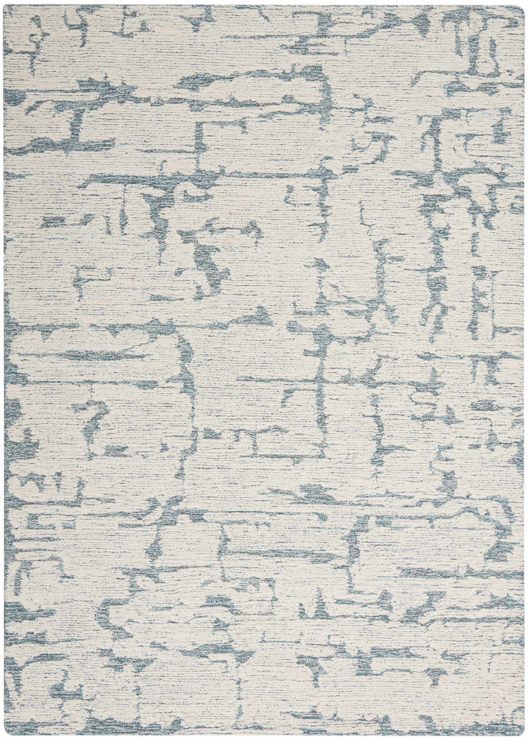 A rectangular area rug with a cream-ivory base covering approximately 70% of the surface. Scattered across the entire field are irregular, organic teal-blue markings that resemble cracked plaster, weathered stone, or abstract brushstrokes — no repeating geometric structure, purely freeform. The teal tones are muted and dusty rather than saturated, blending softly into the cream ground. The pile is medium height with a slightly textured, woven surface appearance. Edges are cleanly bound with no fringe or tassels. The overall impression at a glance is calm, cool, and sculptural — like a piece of abstract art underfoot.