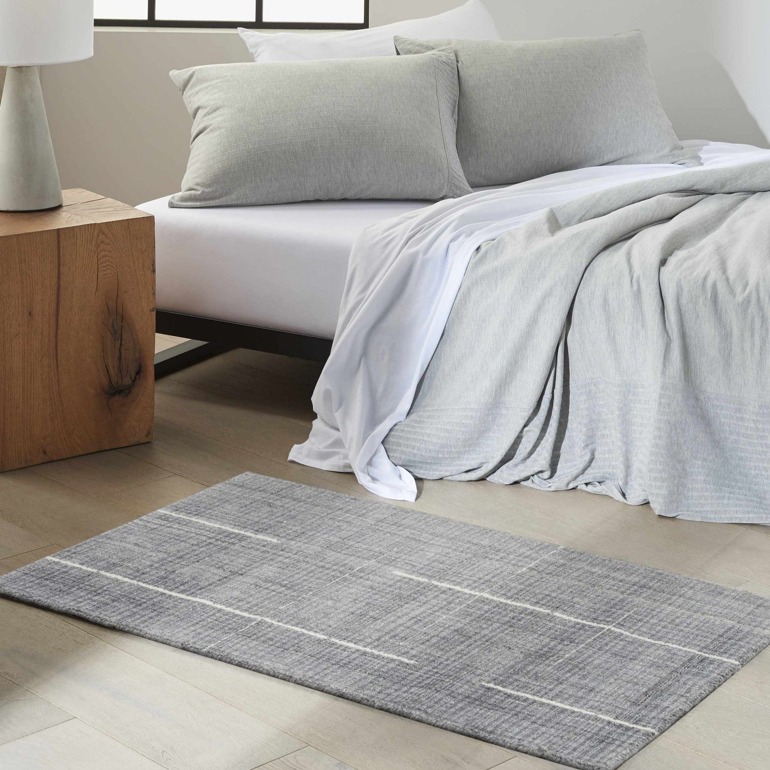 A sophisticated gray woven rug with a subtle geometric stripe grid — the Calvin Klein Architectura brings quiet modern elegance to any living space.