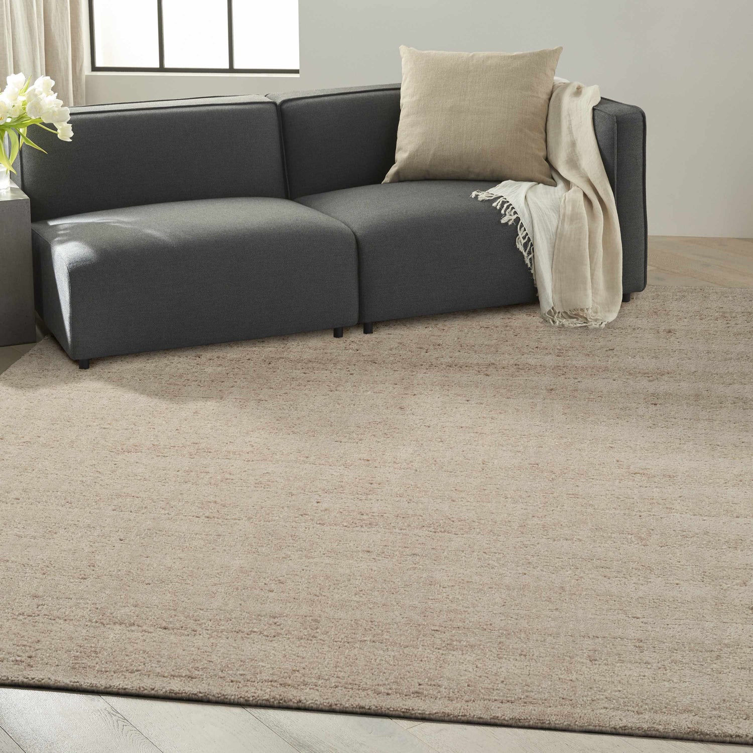 Warm beige, plush pile, and a quiet tone-on-tone texture — the Calvin Klein Spun rug is the understated anchor every neutral room needs.