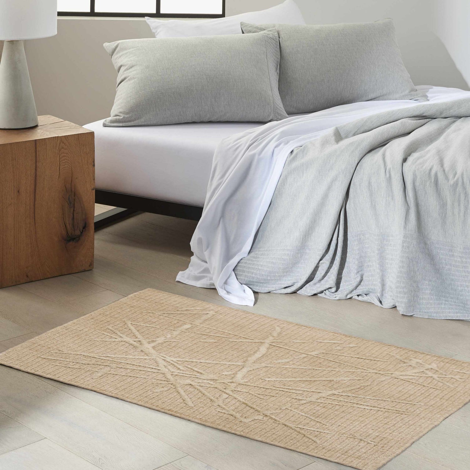 A rectangular area rug with a warm sandy beige ground and a raised abstract branch pattern rendered in cream/off-white. The branches radiate organically from a central cluster, extending outward in irregular, angular lines that suggest bare winter twigs or cracked earth — neither perfectly symmetrical nor chaotic. The background has a fine, knitted or tufted texture that gives it visual depth even in the plain areas. The raised motif creates a subtle sculptural relief against the ground. Edges are cleanly bound with no fringe or tassels. The overall impression is calm, organic, and tone-on-tone — the entire rug reads as a warm neutral from a distance, with the pattern only revealing itself up close.