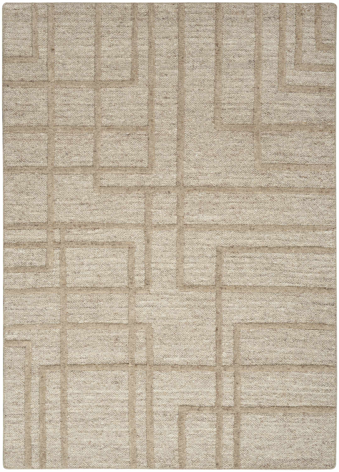A rectangular area rug in a warm tone-on-tone palette of sandy beige and cream. The surface features a bold interlocking geometric pattern of nested angular squares and L-shaped lines, creating a maze-like or labyrinthine grid effect across the entire field. The pattern lines are rendered in a slightly deeper tan-beige against a lighter cream-beige ground, giving the design a subtle but clearly defined contrast. The pile is medium height with a lightly textured, hand-crafted appearance — individual fibers are visible, adding warmth and depth to the surface. Edges are cleanly bound with no fringe or tassels. The overall impression is of a modern, architectural rug with quiet sophistication.