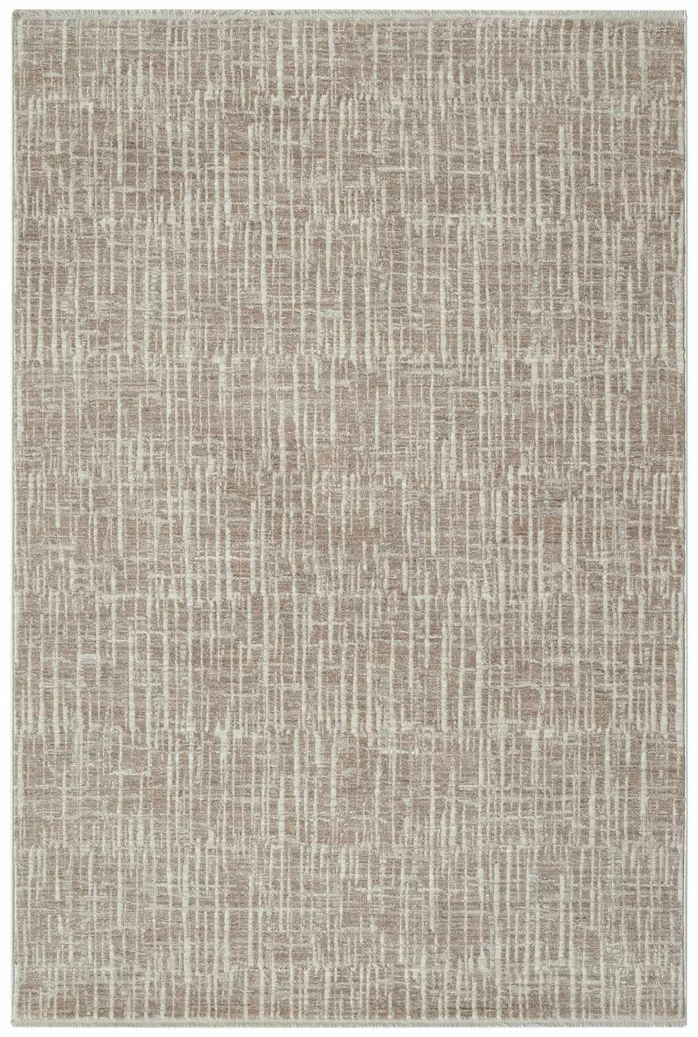A rectangular area rug with an allover abstract texture pattern rendered in warm mid-gray as the dominant color, with sandy beige and soft cream tones breaking through in irregular vertical and horizontal brushstroke-like marks. The pattern has no defined repeat — it reads as an organic, woven or hand-textured surface similar to raw linen or a loosely woven fabric, with slight tonal variation across the field. The pile is low and smooth, giving the surface a flat, refined appearance. Edges are cleanly bound with no fringe or tassels. At a glance, the rug reads as a sophisticated warm gray with a subtle, almost distressed texture that adds depth without any bold contrast.