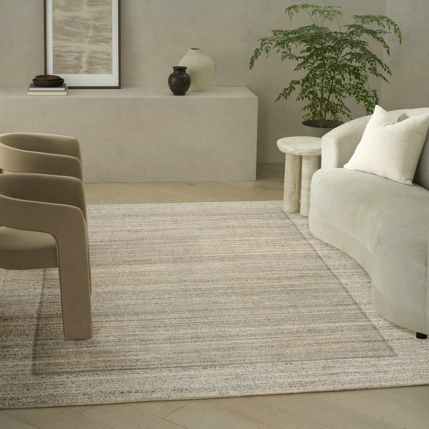 Soft gray and ivory wool with subtle horizontal striping and a clean border — the Calvin Klein Ridge is the effortlessly neutral anchor every room needs.