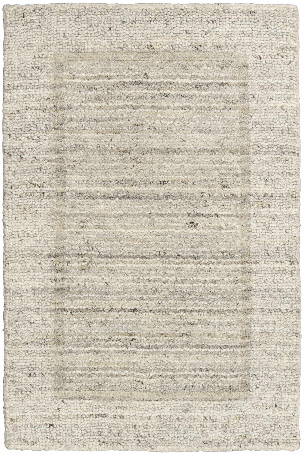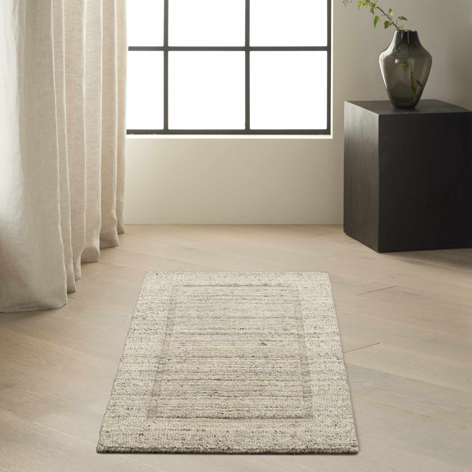 A rectangular medium-pile area rug in a soft blend of warm gray and ivory. The surface features subtle horizontal striping created by the woven wool texture — the stripes are tonal rather than high-contrast, giving the rug a quiet, organic rhythm. A clean, slightly recessed tonal border frames the entire rug, adding structure without introducing a new color. The pile is medium height with a slightly nubby, hand-woven appearance — not smooth or flat, but not shaggy either. The overall impression is of a calm, sophisticated neutral rug with natural texture and understated pattern. Bound edges, no fringe or tassels.
