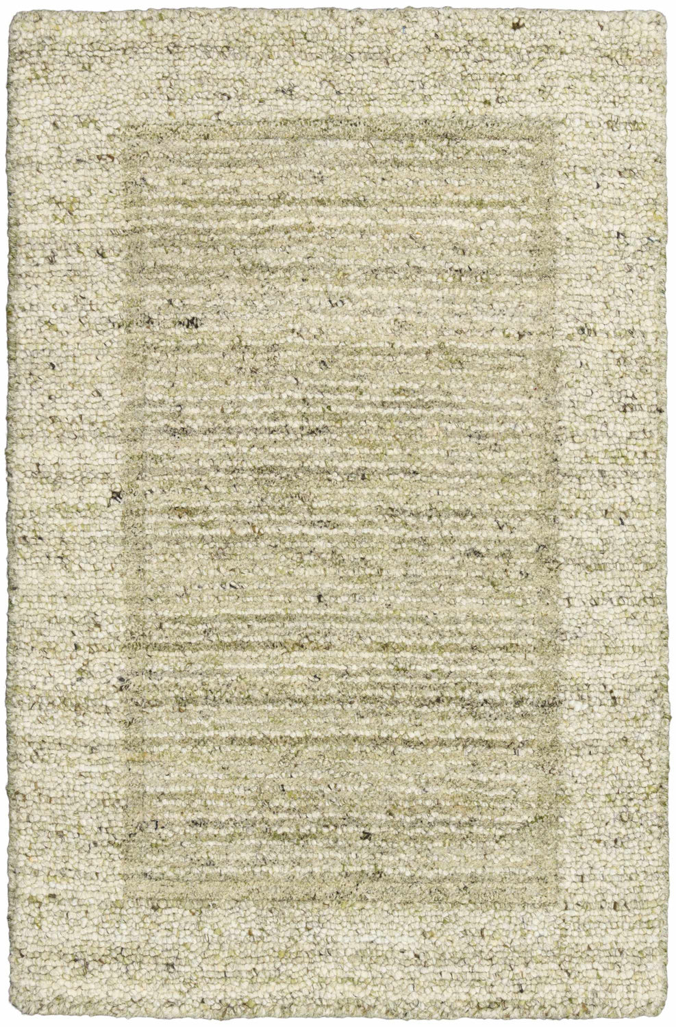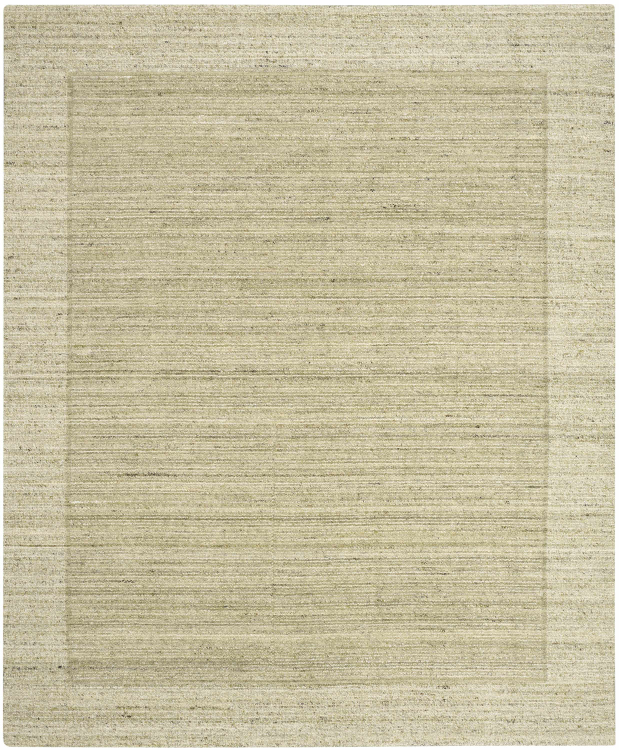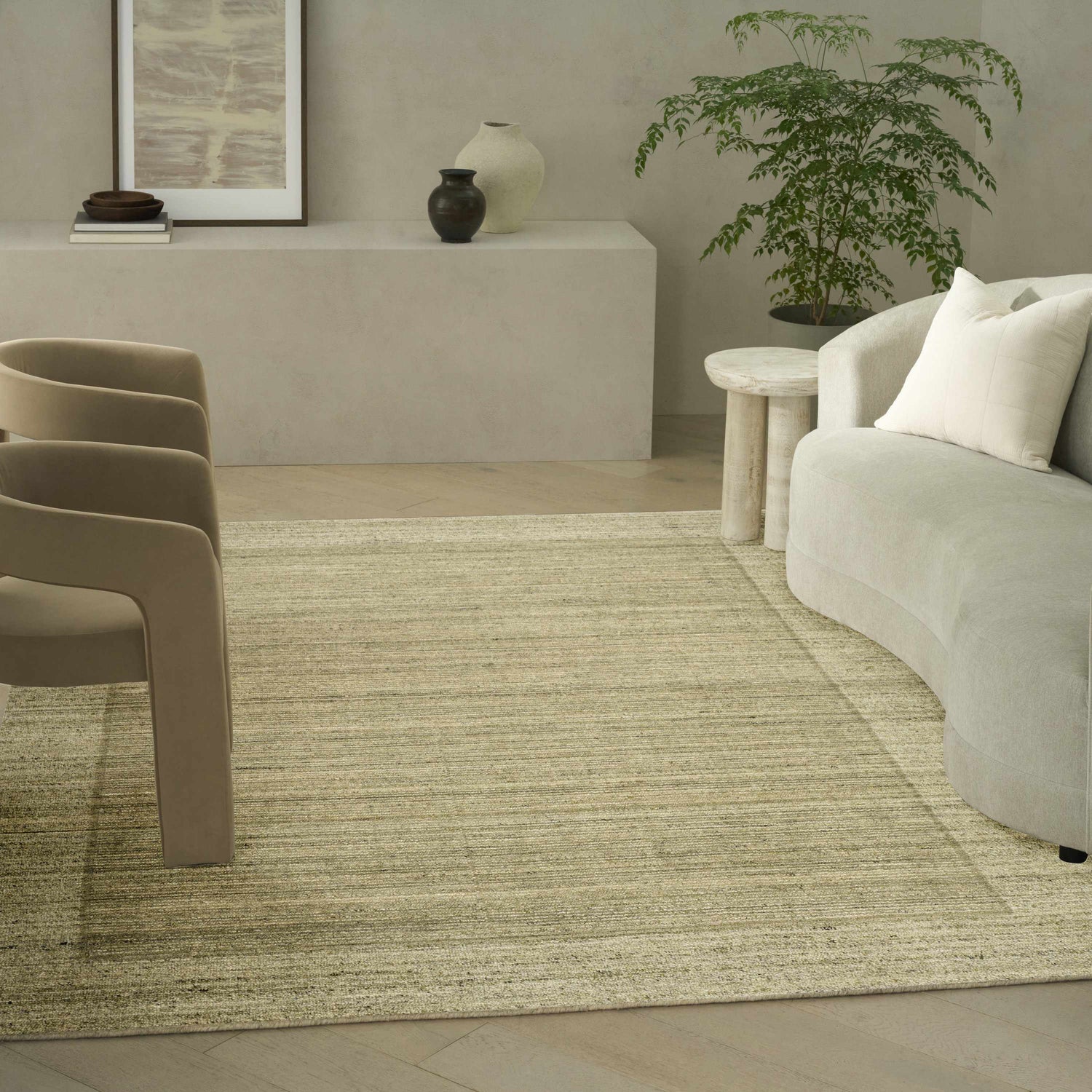 A rectangular area rug with a warm ivory base woven through with muted sage green tones, creating a softly textured, heathered surface with visible horizontal weave lines. A clean, simple rectangular border in a slightly deeper sage-ivory tone frames the entire rug, set inward from the edge by a few inches. The overall surface has a natural, organic quality with subtle flecks of color variation throughout — not a flat printed look but a genuinely woven texture. Edges are neatly bound with no fringe or tassels. The palette is entirely neutral and earthy — ivory, soft sage, and warm beige — with no bold contrasts. At a glance it reads as a calm, understated, lightly textured neutral rug with a quiet border detail.