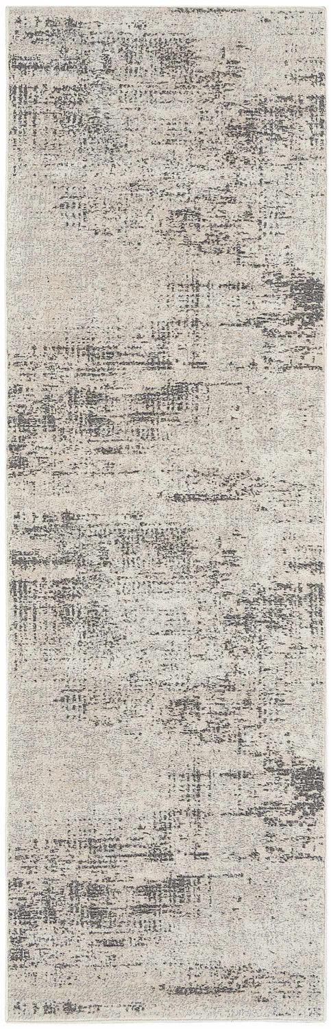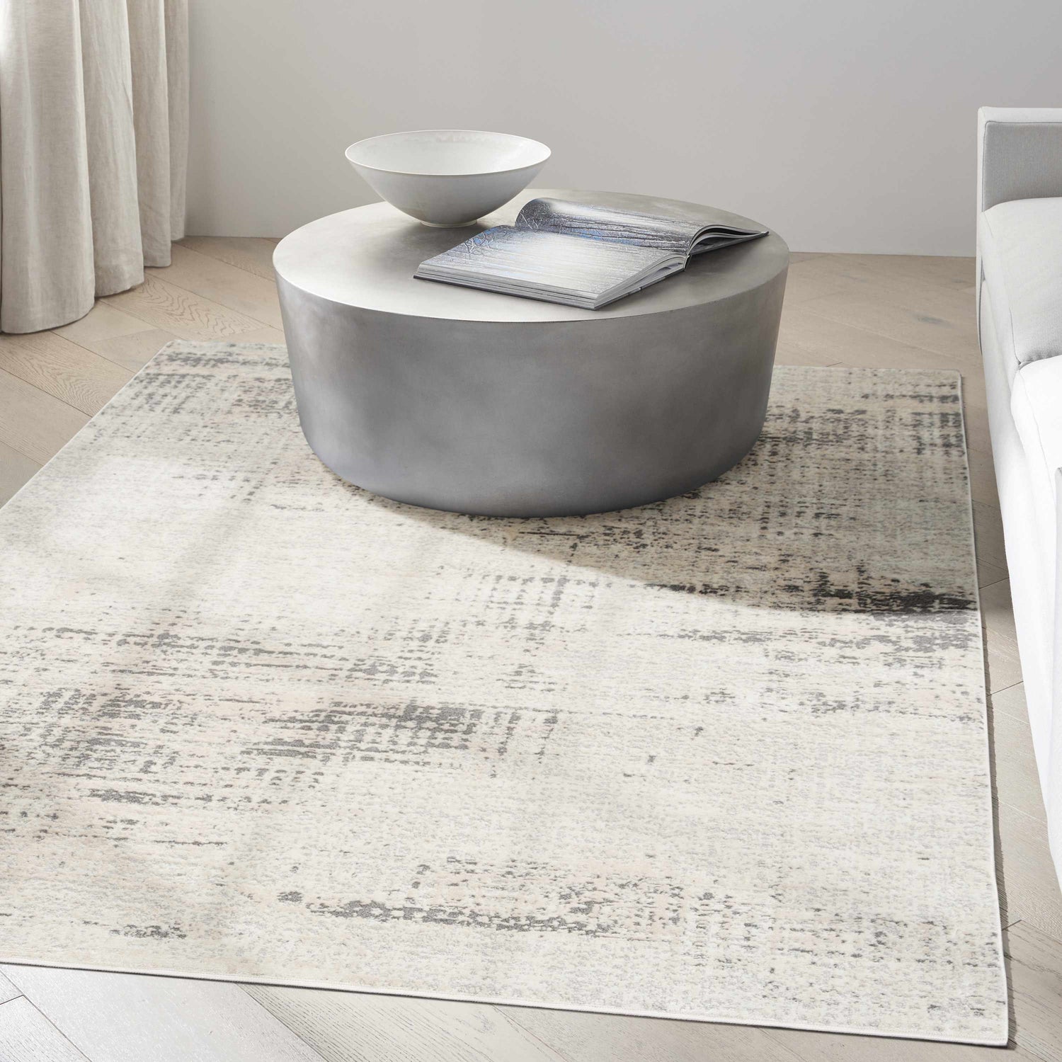 A rectangular area rug with an allover abstract pattern rendered in soft ivory, warm beige, and layered tones of medium and dark gray. The design has a painterly, slightly distressed quality — irregular brushstroke-like marks and mottled texture distributed evenly across the entire surface with no central focal point or border. The pile is medium height with a smooth, slightly textured machine-woven surface. Edges are cleanly bound with no fringe or tassels. At a glance, the rug reads as a soft, tonal ivory-gray field with organic dark gray markings scattered throughout, giving it a calm, contemporary, almost watercolor-like visual impression.