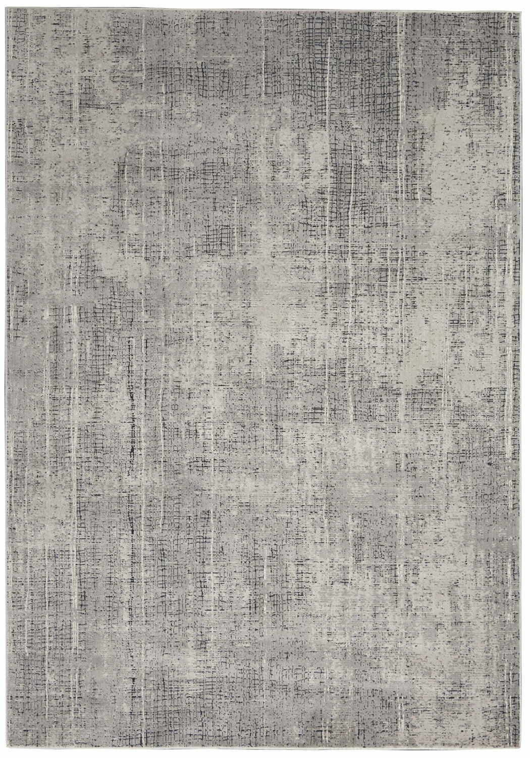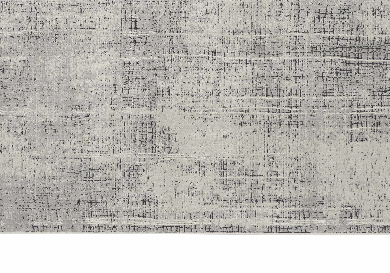 A long, narrow rectangular runner rug with an allover abstract pattern rendered in layered tones of cool mid-gray, soft ivory, and near-white. The pattern has a faded, distressed quality — as if color has been gently washed away in irregular patches, creating a subtle depth and movement across the surface. Thin, irregular vertical and horizontal streaks of darker charcoal gray weave through the lighter ground, giving the impression of a lightly textured, worn textile. The pile is very low and smooth, with a machine-woven surface that appears flat and even. Edges are cleanly bound with no fringe or tassels. The overall impression is calm, cool, and quietly sophisticated — like a modern abstract painting rendered in textile form.