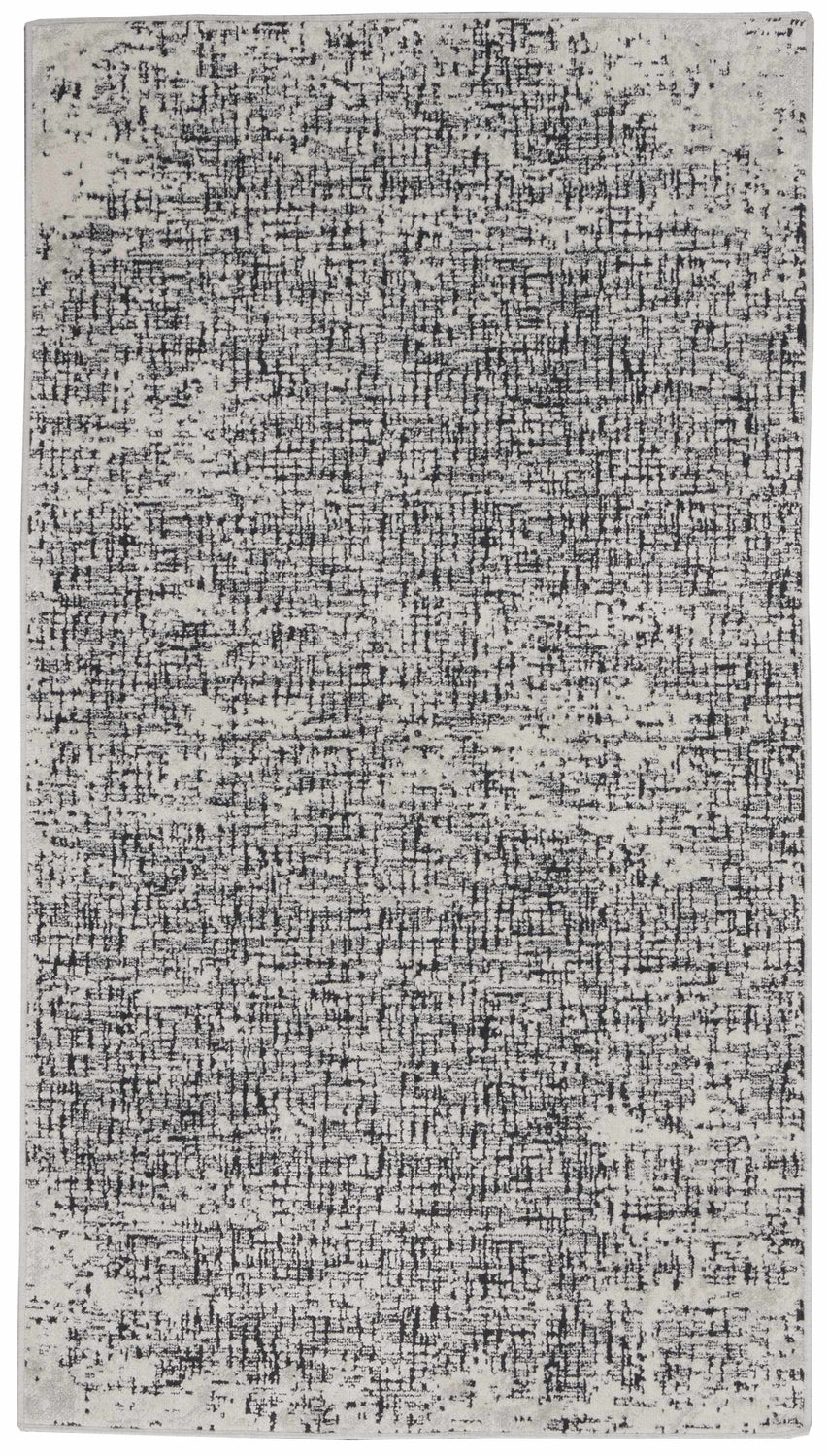 A rectangular area rug with an allover abstract crosshatch pattern rendered in black ink-like strokes on an ivory and off-white base. The marks are dense, irregular, and layered — resembling a hand-drawn grid or woven textile seen up close — creating a soft gray visual blend from a distance with sharp black-and-white contrast up close. Subtle cloud-like variations in the ivory background give the rug a slightly distressed, organic feel. The pile is very low and flat with a smooth machine-woven surface texture. Edges are cleanly bound with no fringe or tassels. The overall impression is graphic, modern, and quietly textural.