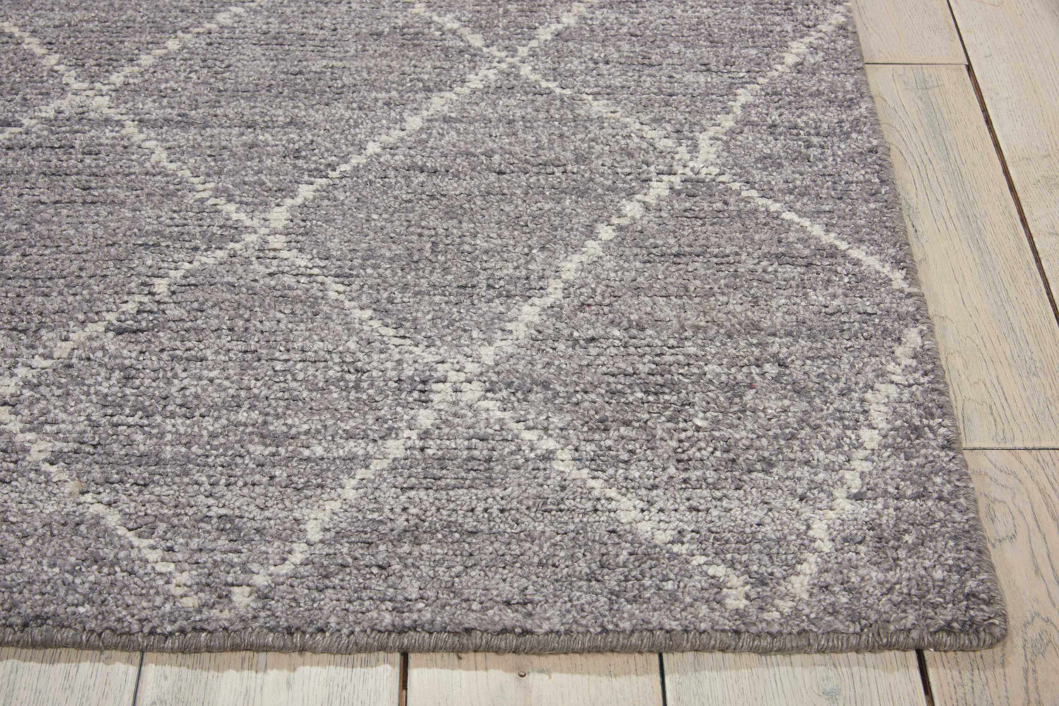 A cool graphite gray field traced with delicate cream diamond lines — the Calvin Klein Heath brings modern Moroccan geometry to any room with quiet confidence.