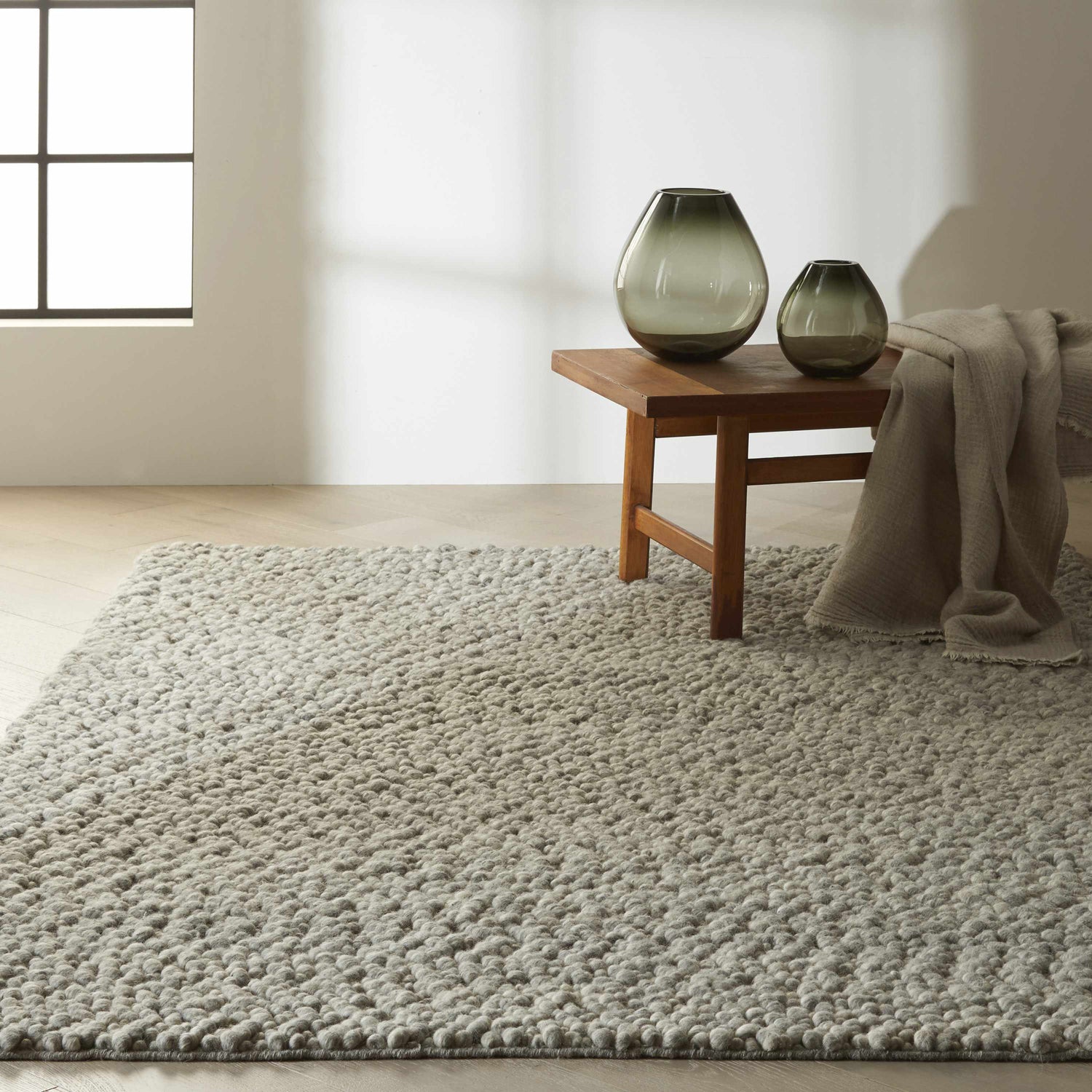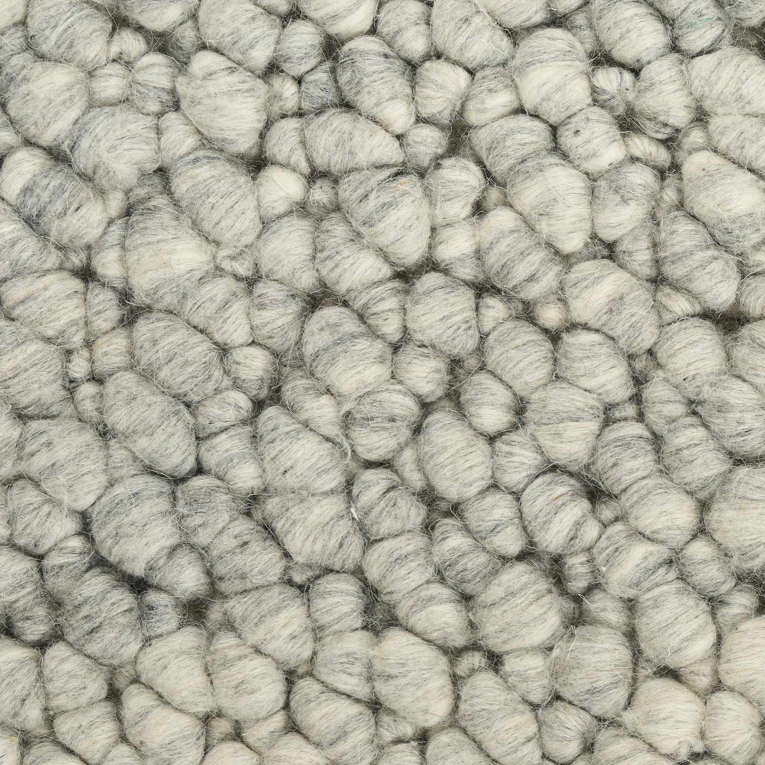A rectangular area rug with an allover dense pebble-like loop texture covering the entire surface. The color palette is a heathered blend of soft medium gray and warm ivory, distributed evenly with subtle tonal variation that creates an organic, stone-like visual effect. The loops are tightly packed and three-dimensional, giving the surface a tactile, sculptural quality visible even in flat photography. There is no fringe, no border, and no distinct pattern — the texture itself is the design. Edges are cleanly bound. The overall impression is of a calm, sophisticated neutral rug with quiet depth.