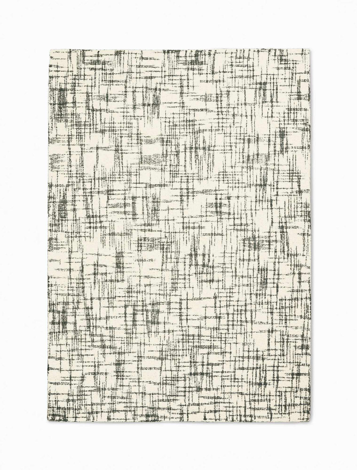 A rectangular area rug with a warm ivory/off-white base covered entirely in an allover abstract crosshatch pattern of irregular, hand-drawn-style charcoal grey lines running in multiple directions. The lines vary slightly in weight and spacing, creating an organic, slightly distressed texture that resembles a loose woven or sketched grid. The overall effect is a soft, tonal two-color design — predominantly ivory with grey linework — that reads as modern and textural from a distance. The pile is visibly low and flat, with a smooth machine-woven surface. Edges are cleanly bound with no fringe or tassels. The rug has a quiet, sophisticated visual impression — neither stark nor busy.