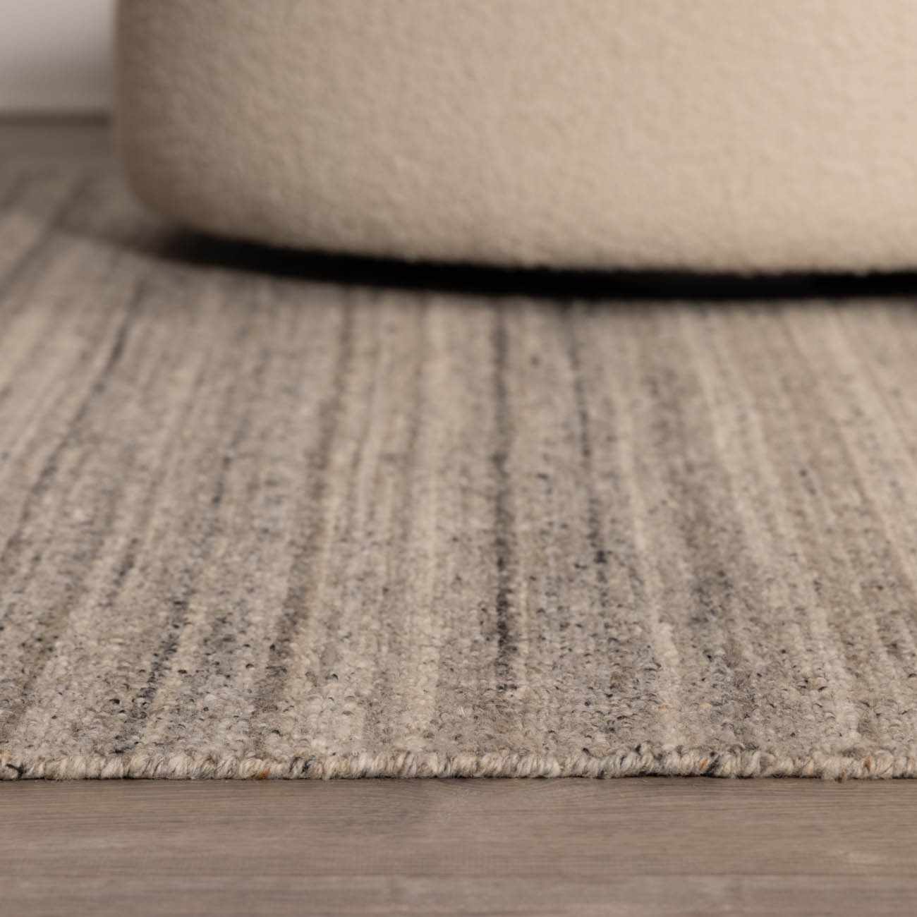 • Close-up of the Blenda Beige Area Rug. Hand-tufted wool rug with subtle charcoal and taupe horizontal stripes. Design-Rectangle-576 Close-up of the Blenda Beige Area Rug showing its wool texture, subtle stripes, and neutral color palette. Front
