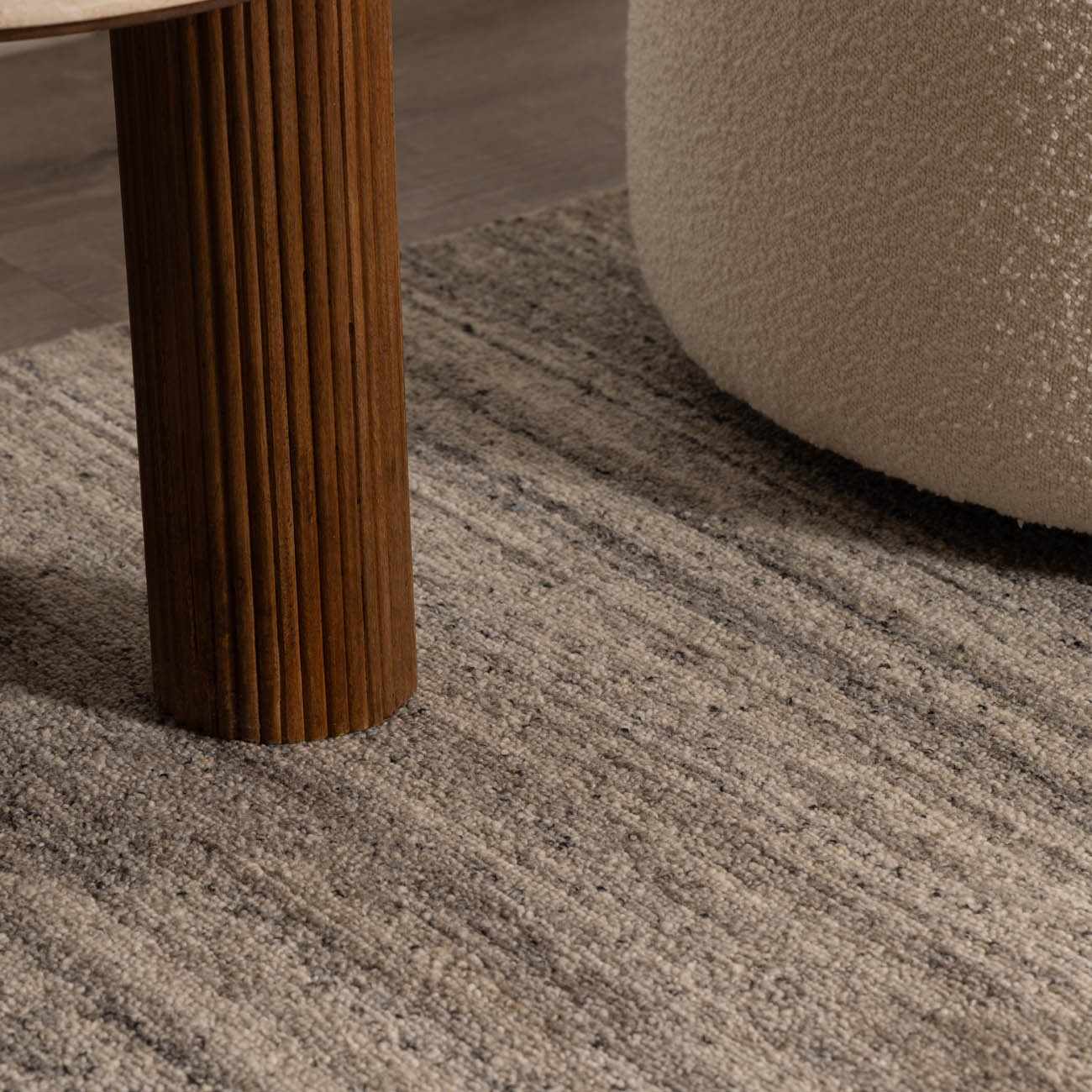 • Close-up of the hand-tufted Tiran Gray Wool Area Rug. The rug has a farmhouse style with gray tones and subtle stripe detail. Design-Rectangle-576 Close-up of the hand-tufted Tiran Gray Wool Area Rug showing texture and neutral gray tones with light wood floors. Corner