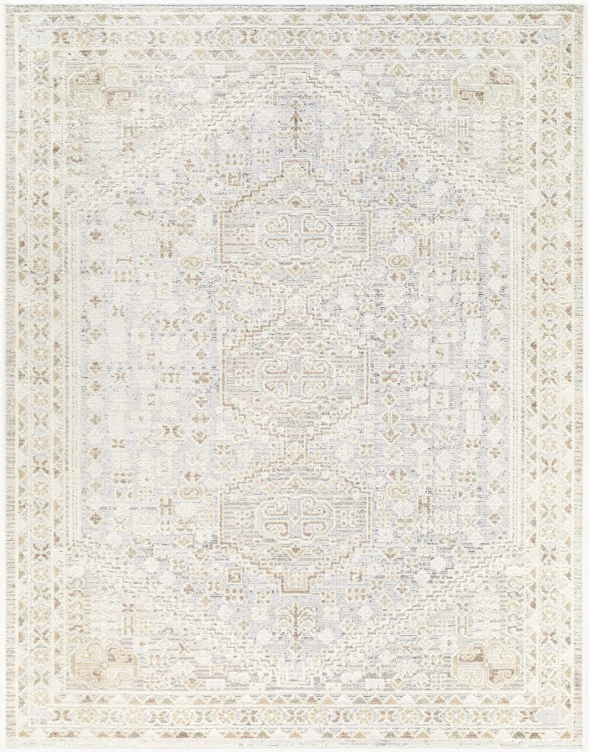 A rectangular area rug with a dominant cream and ivory field, featuring a large central medallion composed of layered geometric and floral-scroll motifs in soft beige, warm tan, and muted gray. The field surrounding the medallion is filled with an allover repeating pattern of small geometric and floral elements in the same muted palette. A structured multi-line border frames the entire rug with intricate geometric detailing in beige and gray tones. The overall finish has a softly faded, washed-out quality — colors are intentionally muted and low-contrast, giving the rug a vintage, sun-worn appearance. The surface is smooth and flat with a very low pile, machine-woven with a tight, even texture. Edges are cleanly bound with no fringe or tassels.