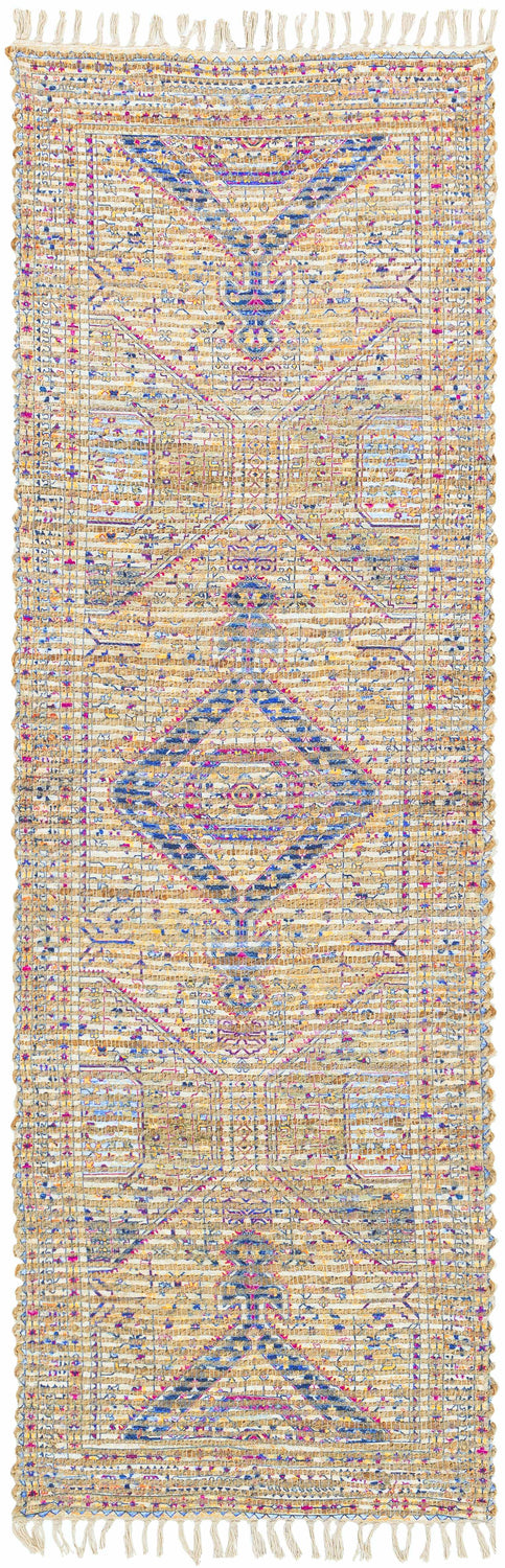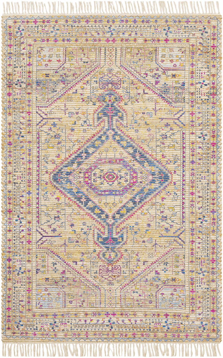 The Celeste Area Rug Collection showcases traditional inspired designs that exemplify timeless styles of elegance, comfort, and sophistication. The meticulously woven construction of these pieces boasts durability and will provide natural charm into your decor space. Made with Jute, Polyester, Cotton in India, and has No Pile.