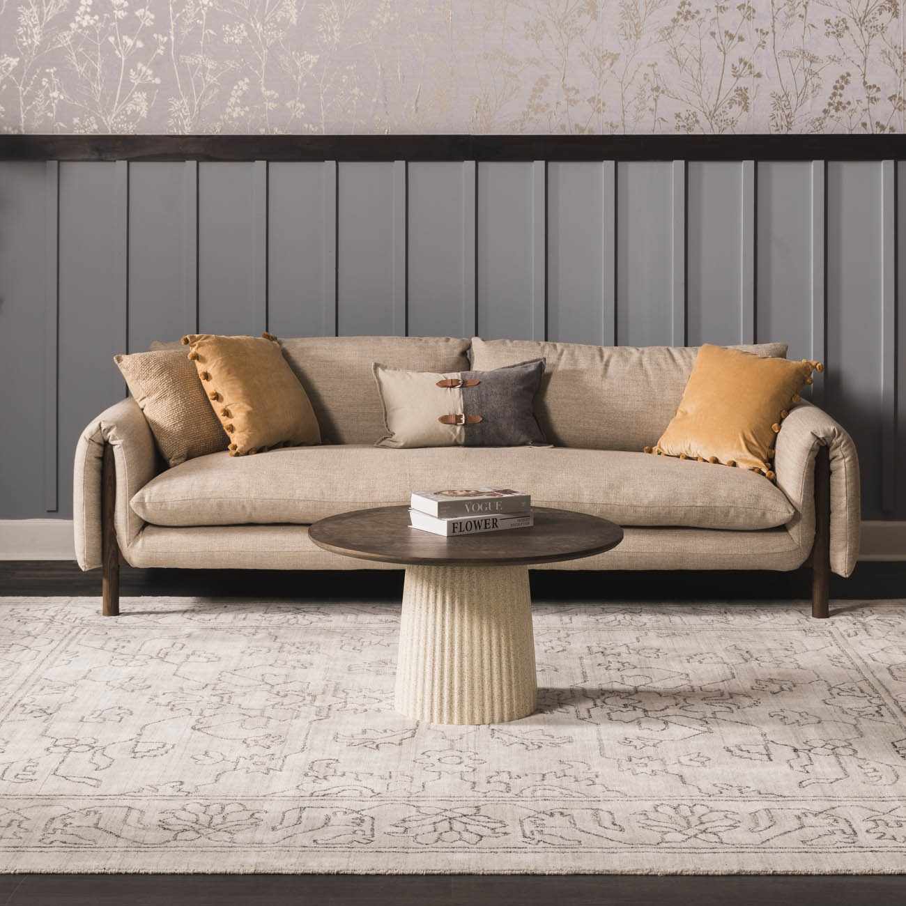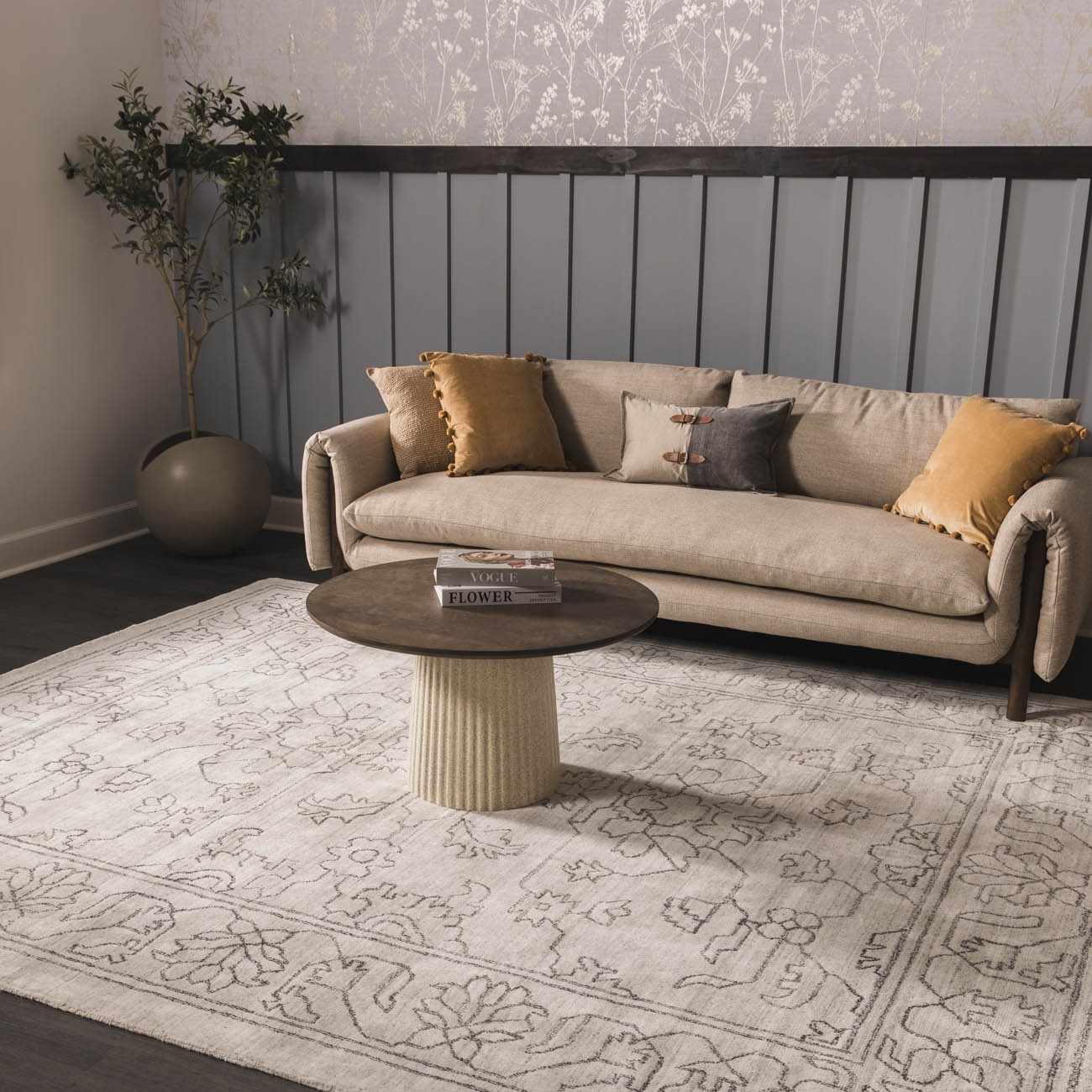 When selecting a living room rug, choose one that anchors your furniture by either placing all the legs on the rug or just the front legs, which helps define the seating area and enhances the room’s acoustics.